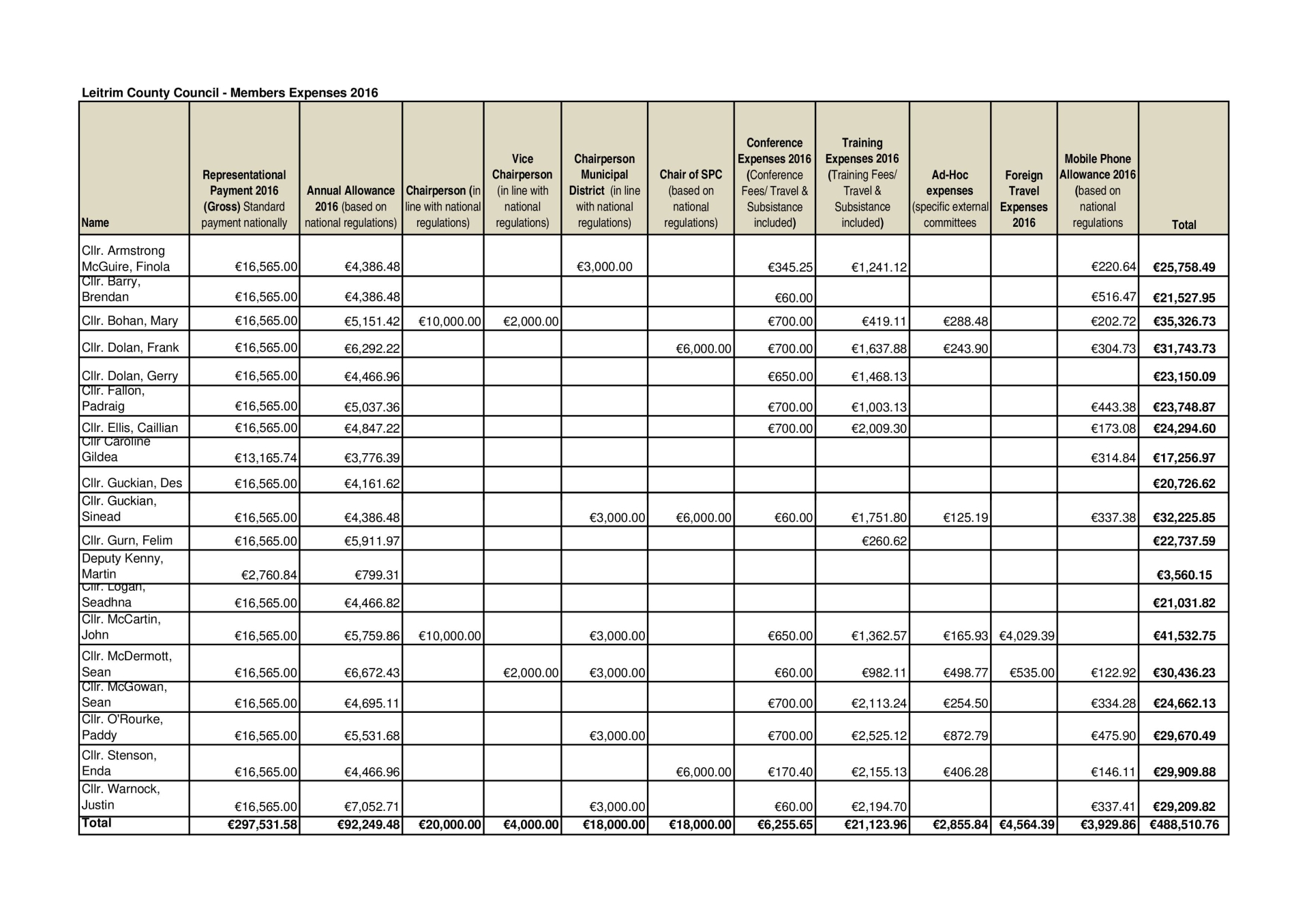 The total paid out in expenses last year was €488,510.76. This is down nearly €25,000 on figures in 2015 when the total paid out was €513,260.