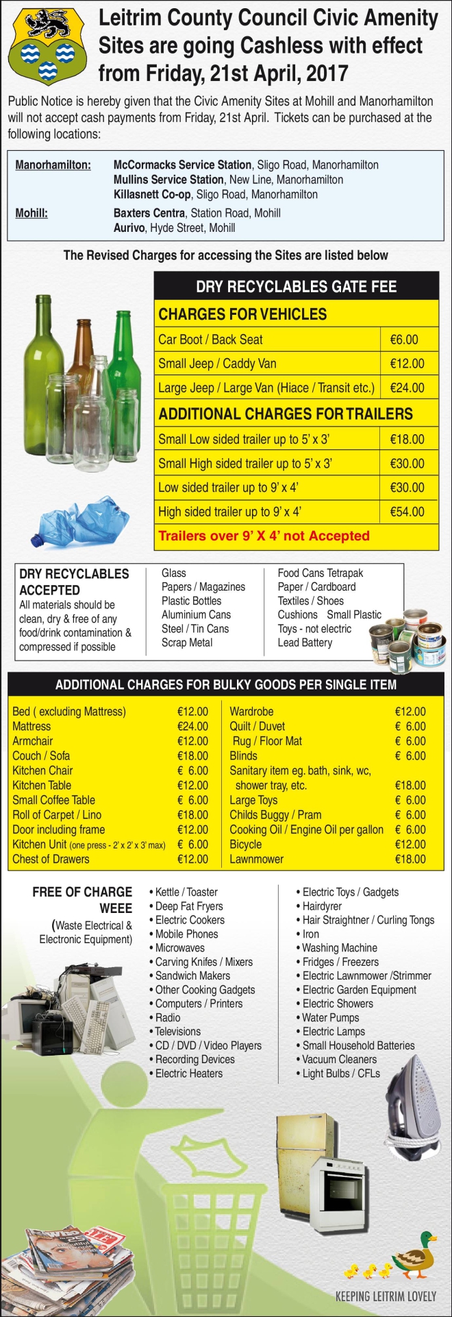 Don't forget that Co Leitrim's Civic Amenity sites in Manorhamilton and Mohill are going cashless from tomorrow.