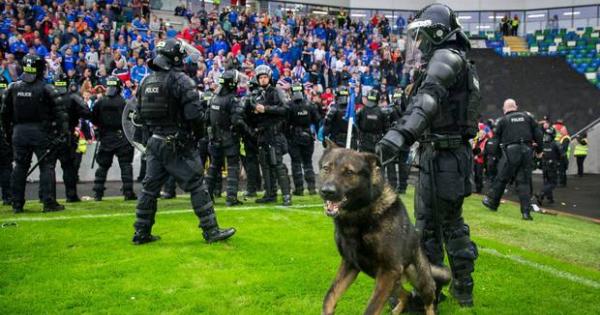 Police in full riot gear and backed up by dogs rushed onto the pitch after the final whistle as home supporters threw missiles at stewards and PSNI officers standing between them and several hundred Celtic supporters who'd managed to get tickets for the match despite their club's refusal to take up their official allocation.