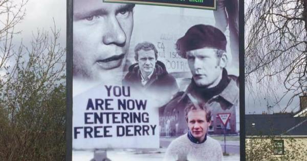 The mural reads: Martin McGuinness 1950-2017 "He expanded the definition of 'us and shrunk the definition of them." It includes pictures of McGuinness from his youth to recent times.