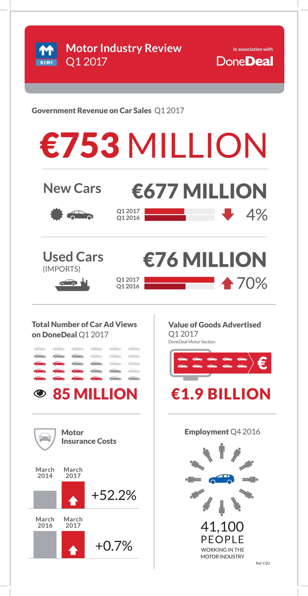 The first Society of the Irish Motor Industry (SIMI)/DoneDeal Quartlery Motor Industry Review for 2017 highlights the challenging and uncertain year that the Industry has faced with new car sales (-8%) and commercial vehicle sales (LGV’s -11% and HGV’s -3%) both reporting a decline in the first quarter of this year.