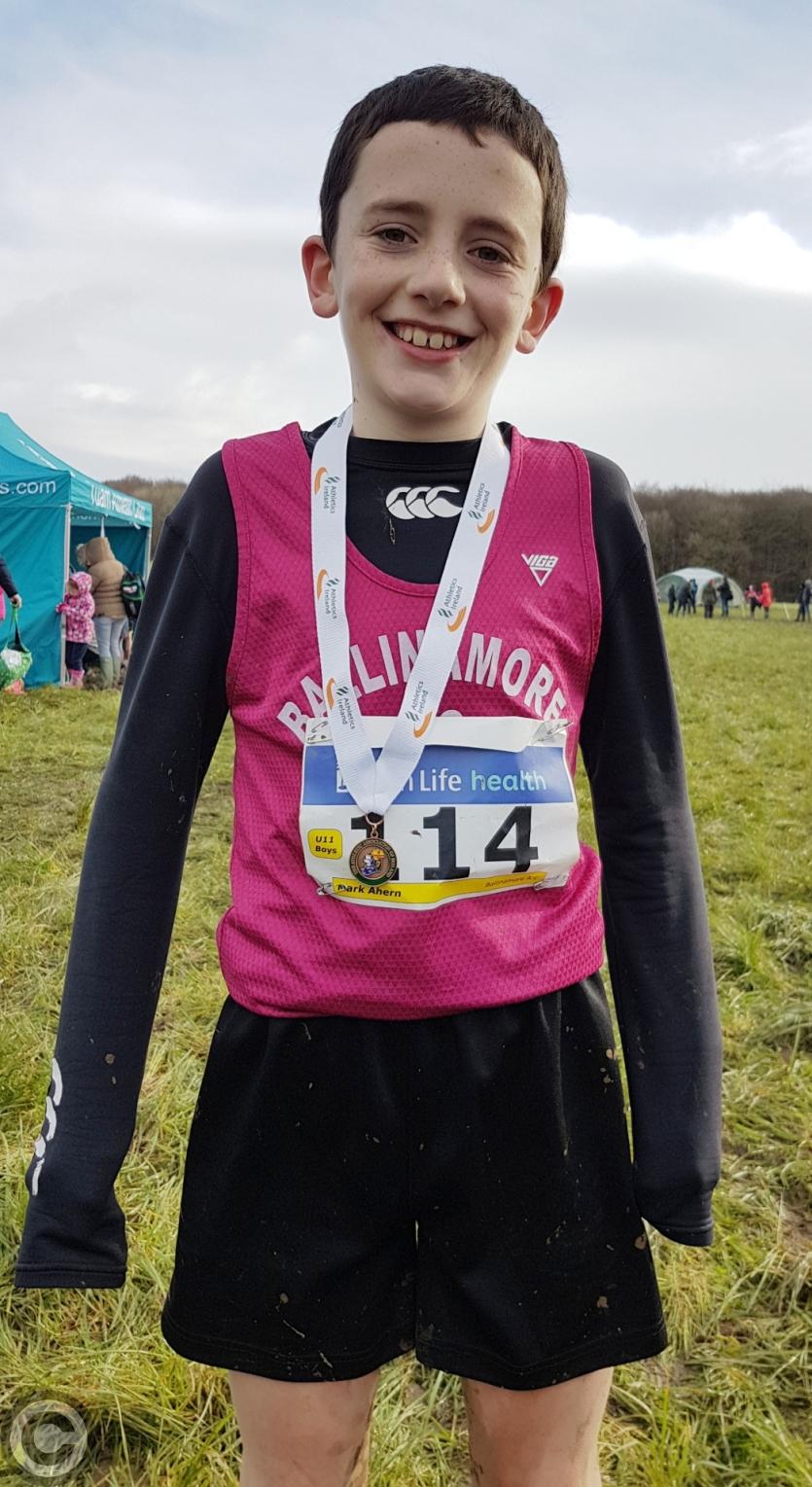 Ballinamore AC's Mark Ahern finished just off the individual podium when he finished 4th in the U11 Boys race in the accompanying Juvenile B Cross-country championships, a strong performance. His brother Niall finished 82nd in the same race.