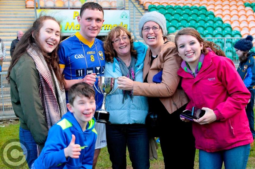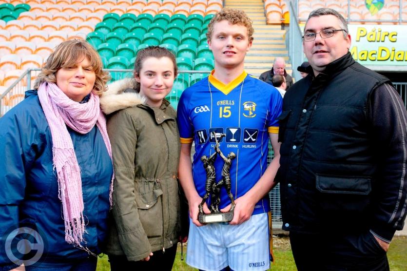 Man of the match Gavin O'Hagan with his mother Eithne, sister Ciara and father Vincent. Photo by James Molloy
