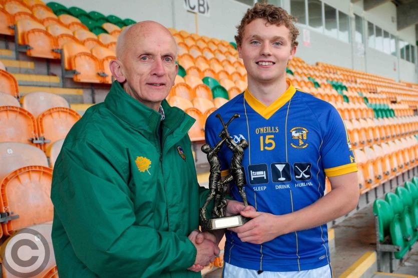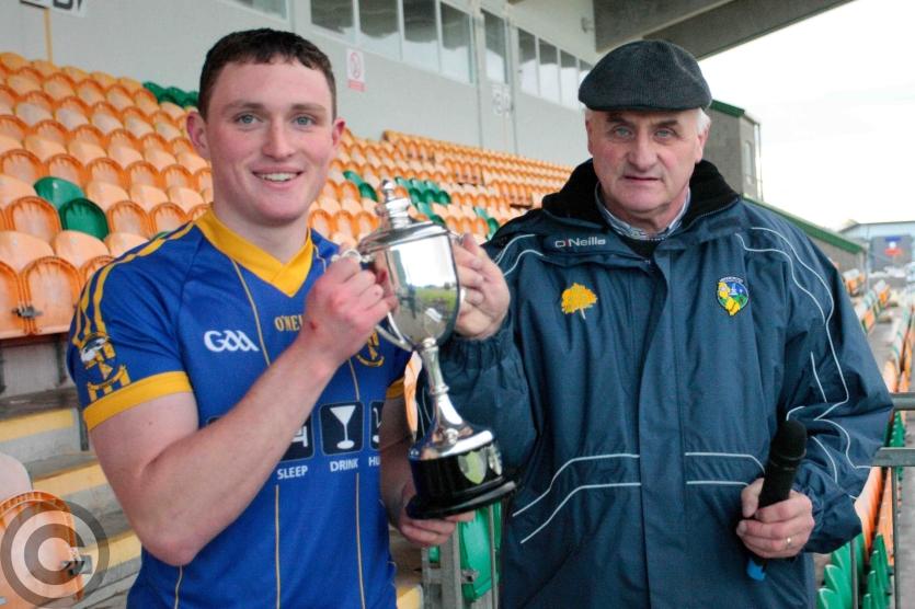 Martin Cunniffe presents the Stephen Dorrigan Memorial Cup to Niall McLoughlin. Photo by James Molloy