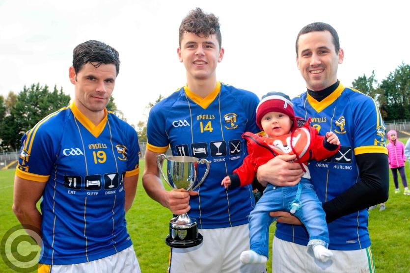 Young James Poniard pictured with his father Michael and uncles David and Peter who all played starring roles in Cluainín Iomáint's victory in the Leitrim Senior Hurling Final on Sunday. Photo by James Molloy