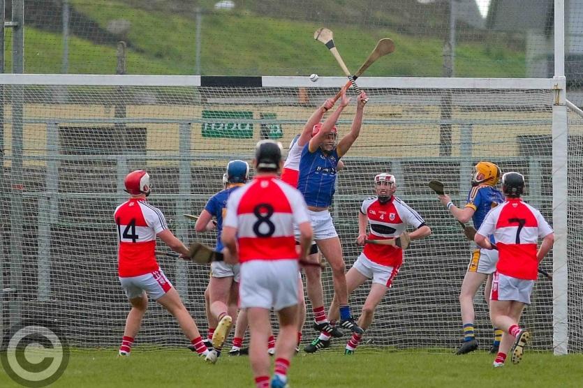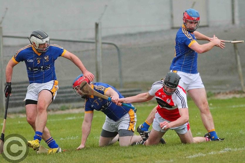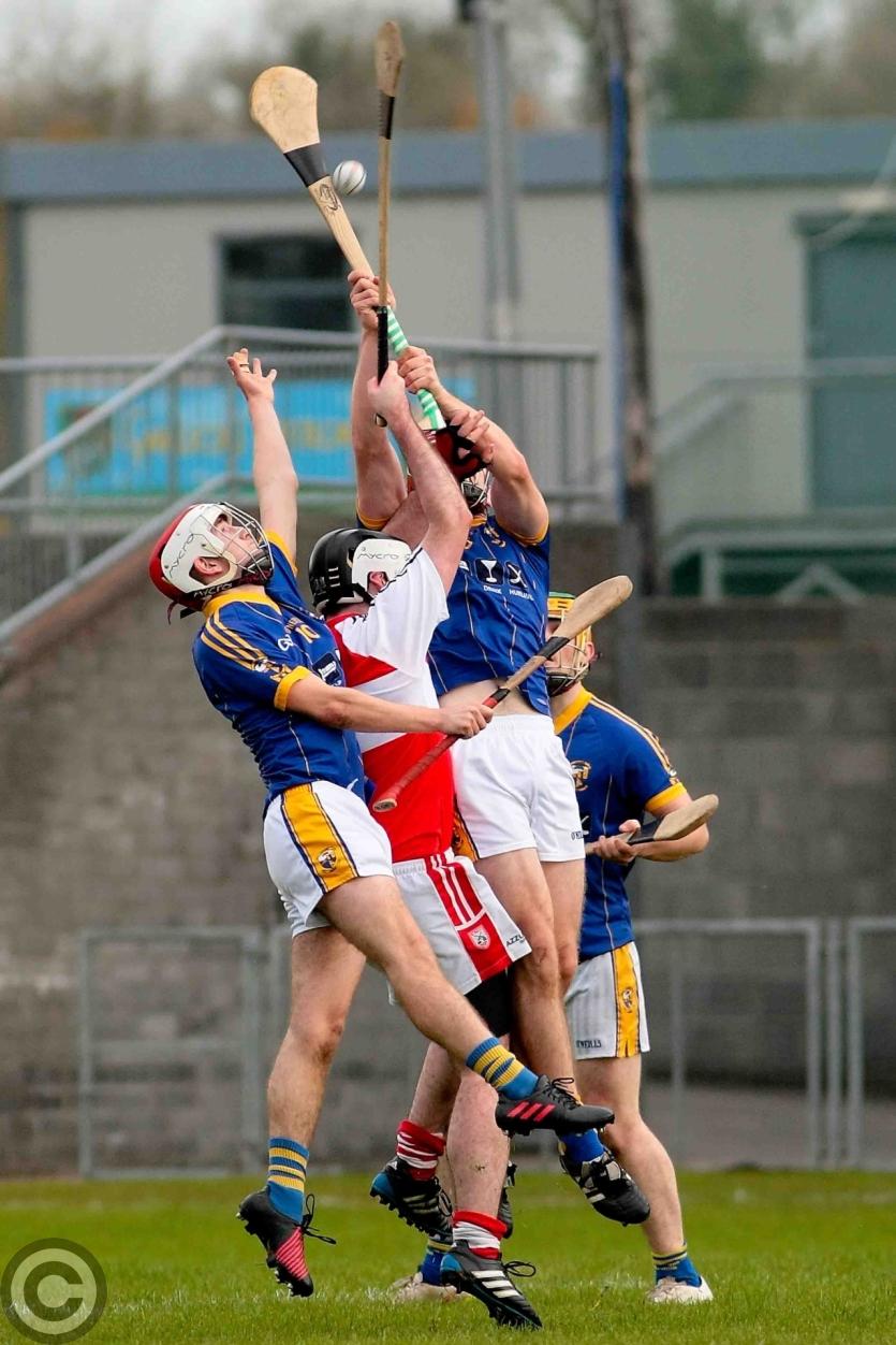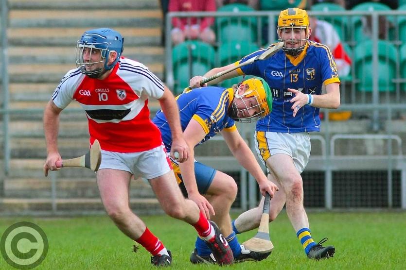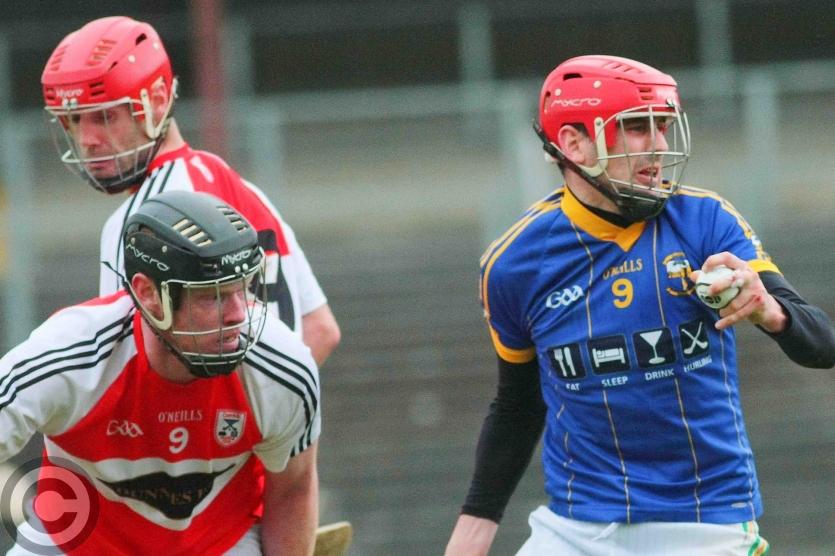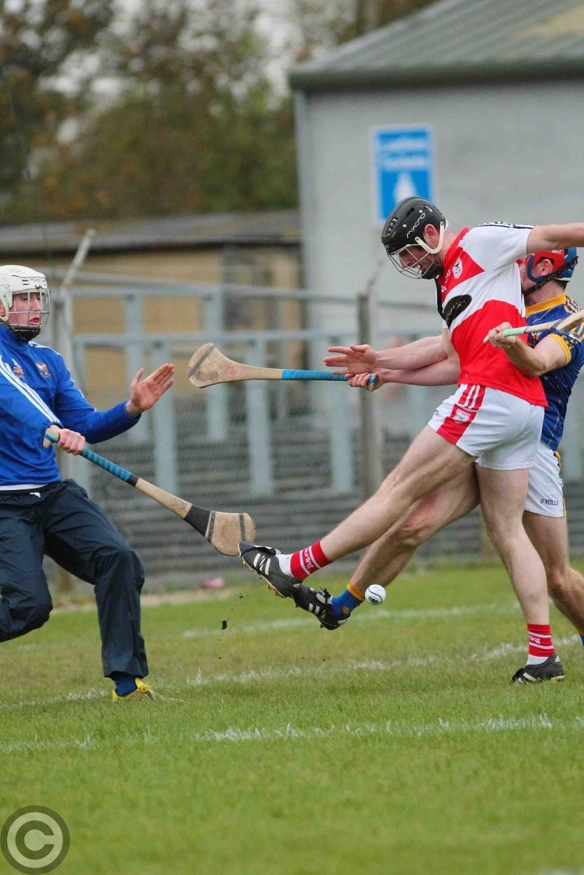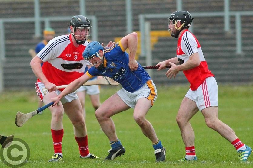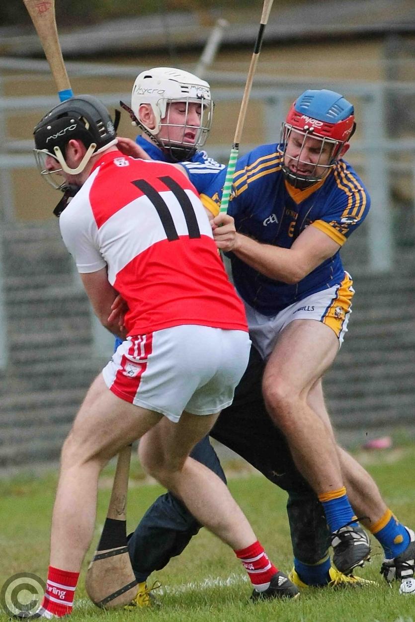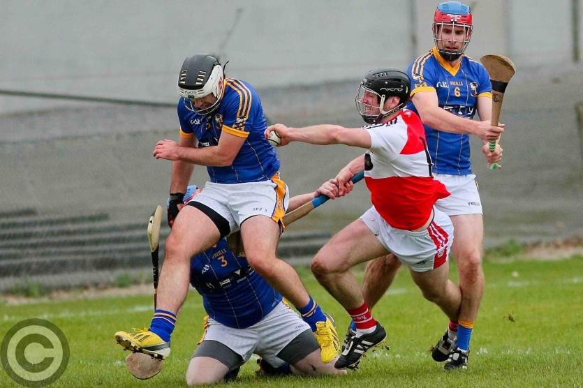 James O'Brien kicks the sliothar away from Liam Moreton with Keeper Karl McDermott in support. Photo by James Molloy