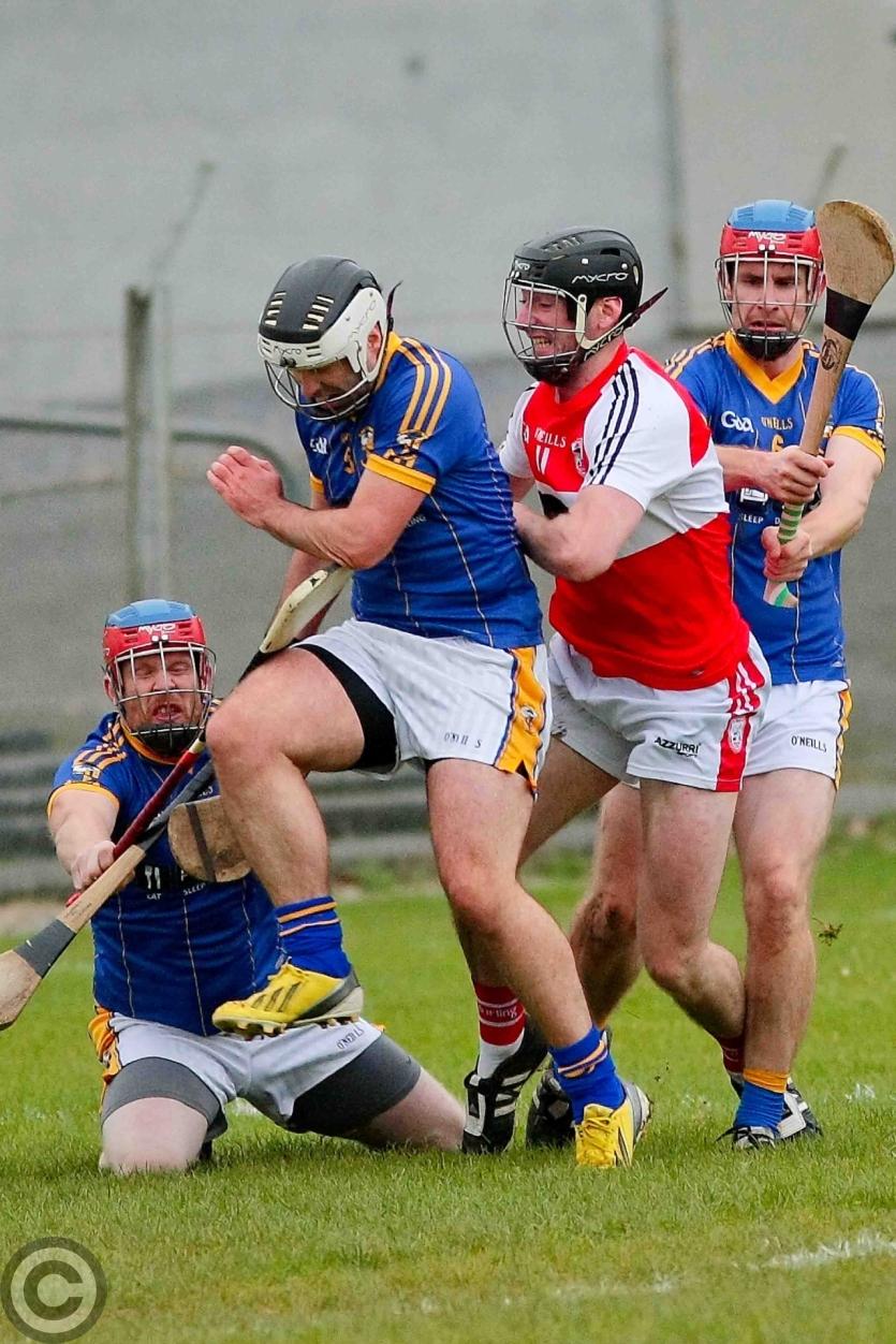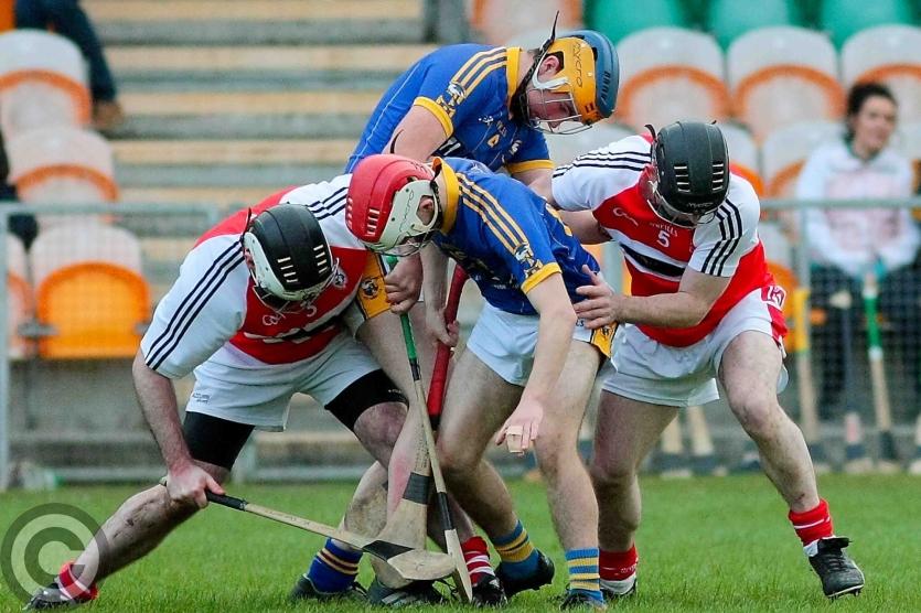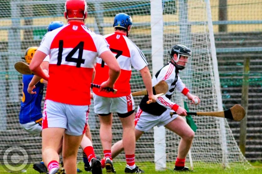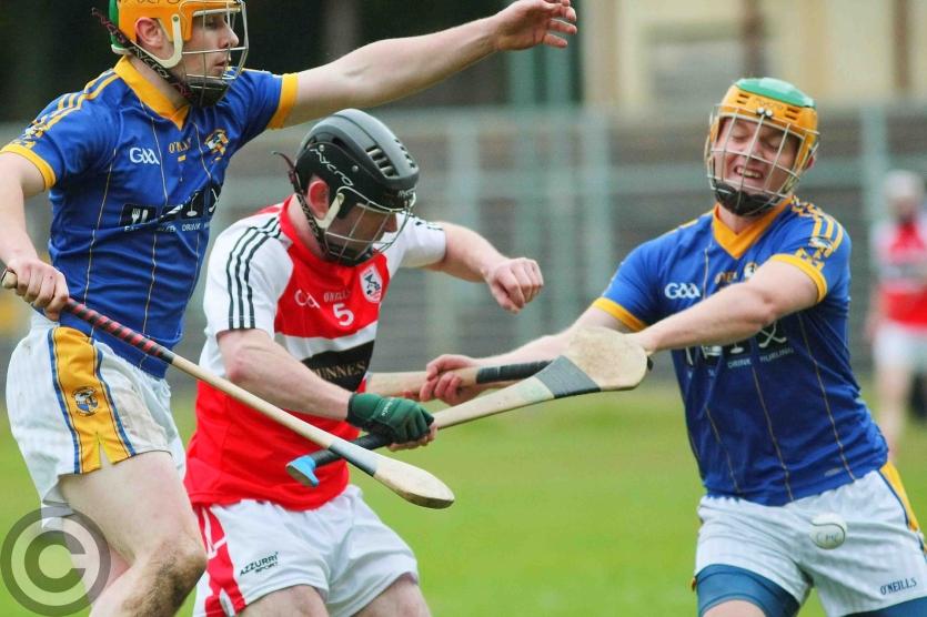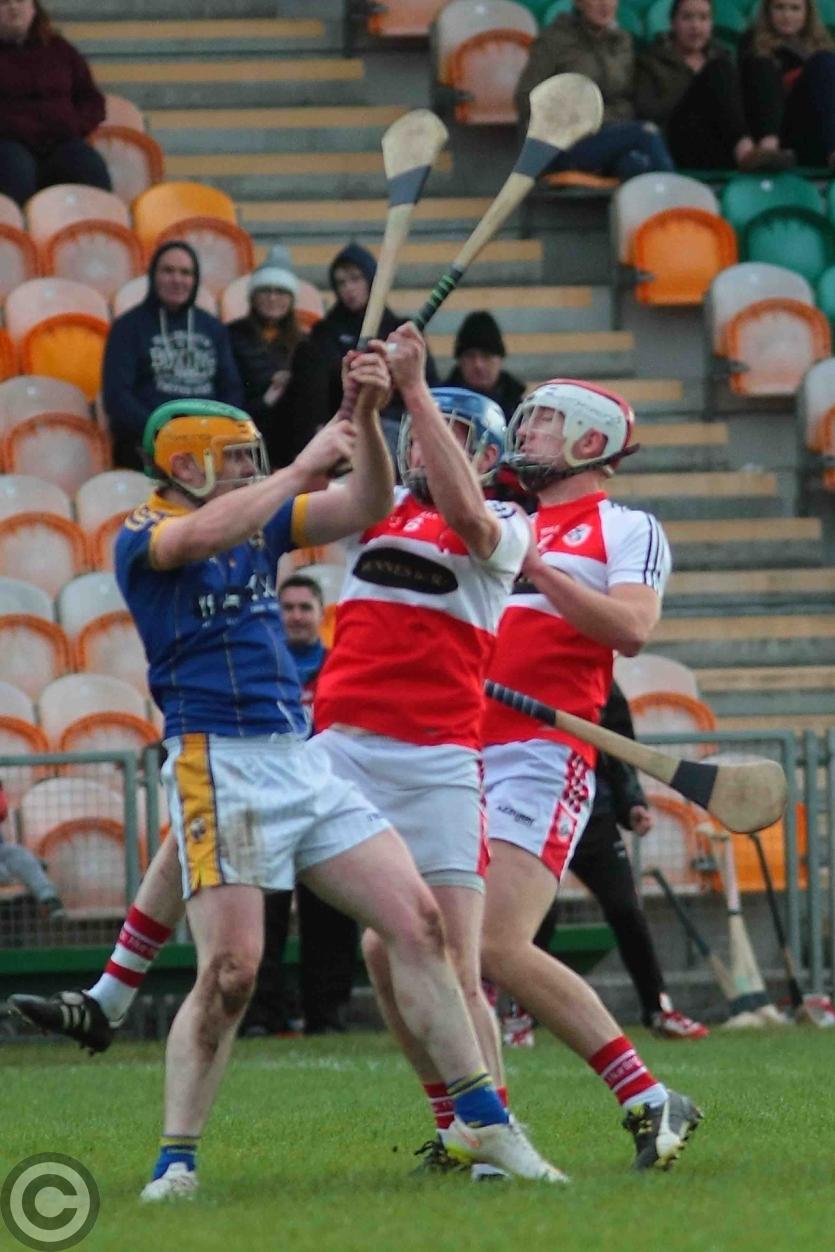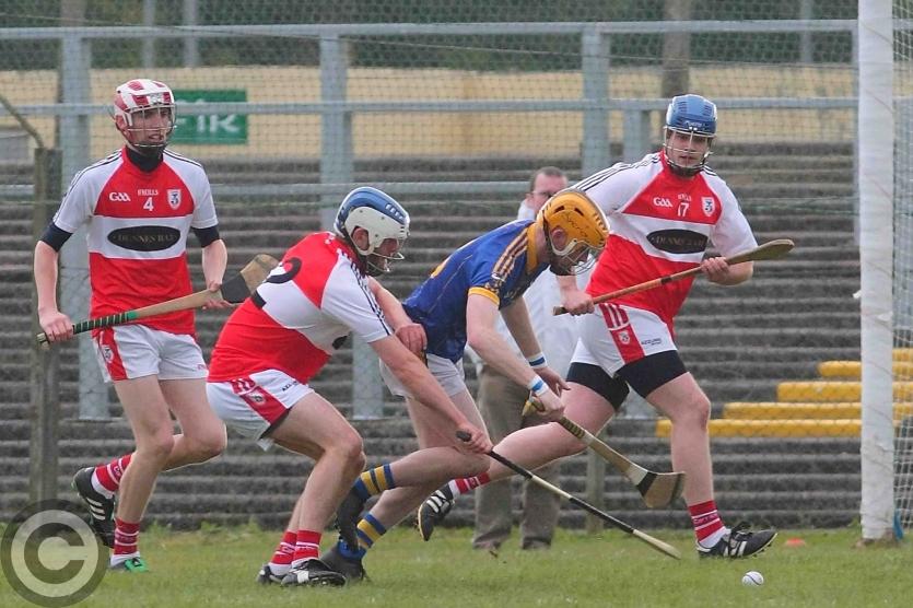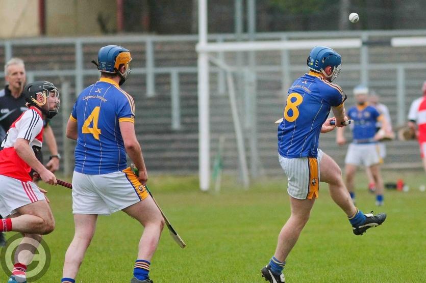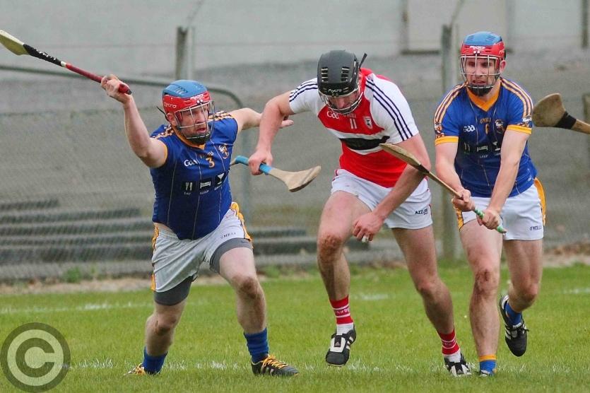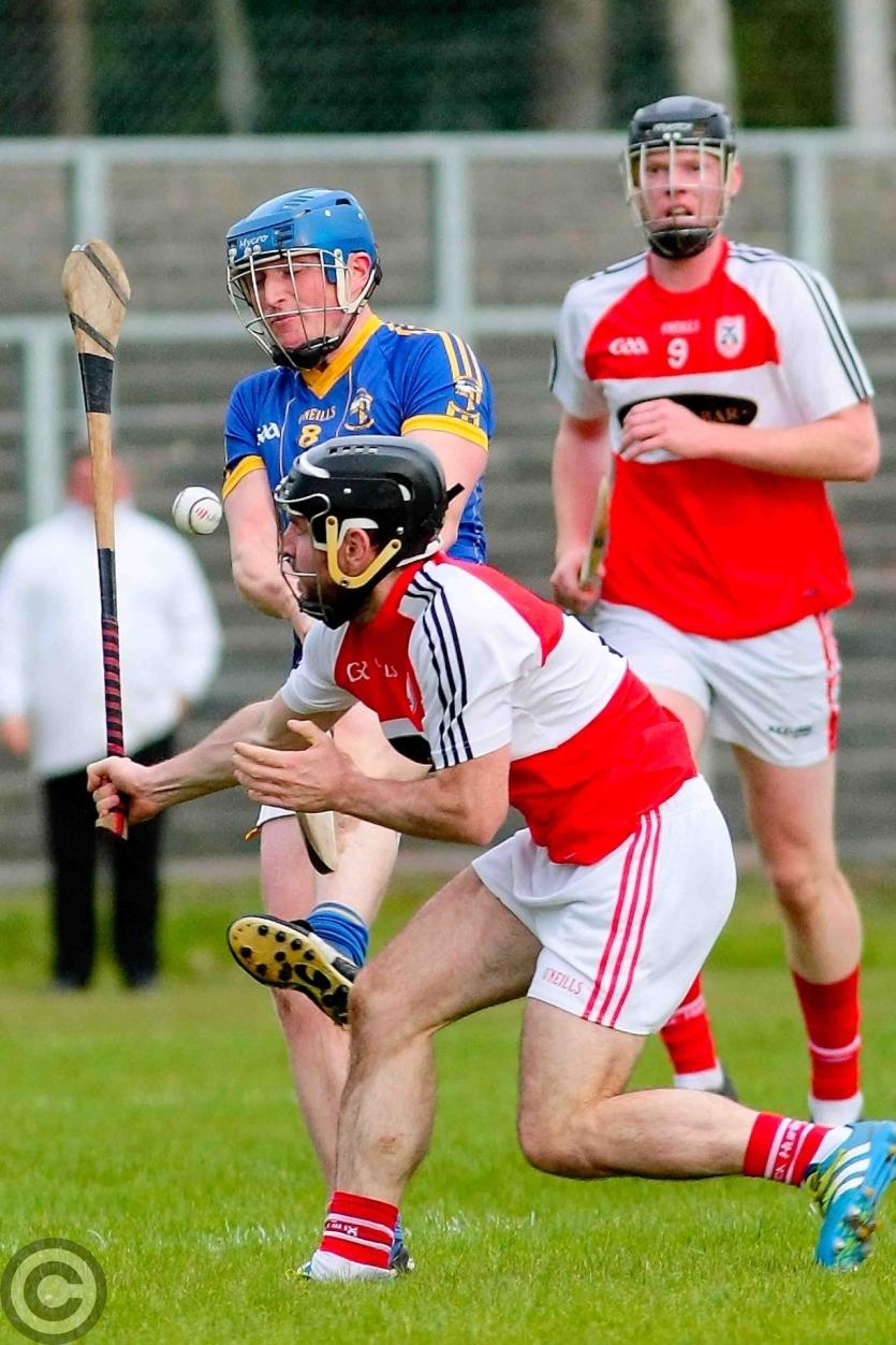 James O'Brien kicks the sliothar away from Liam Moreton with Keeper Karl McDermott in support. Photo by James Molloy