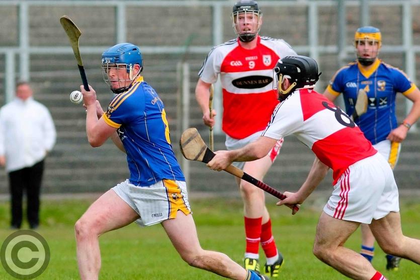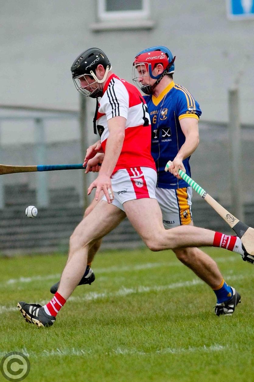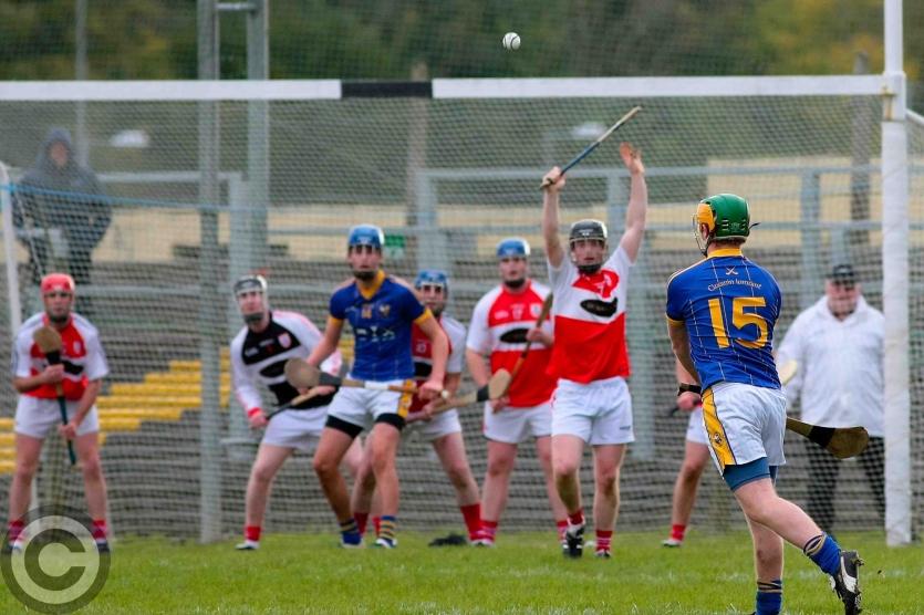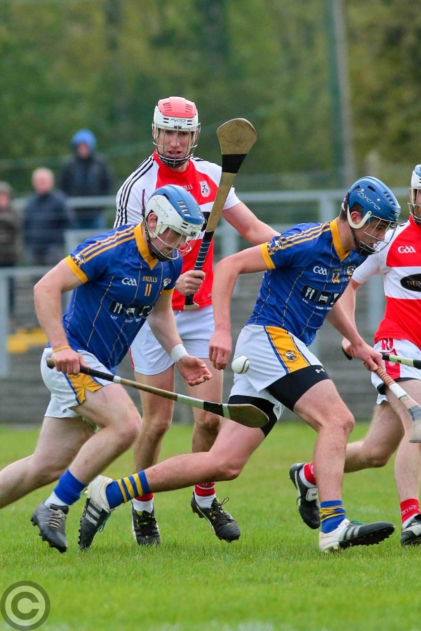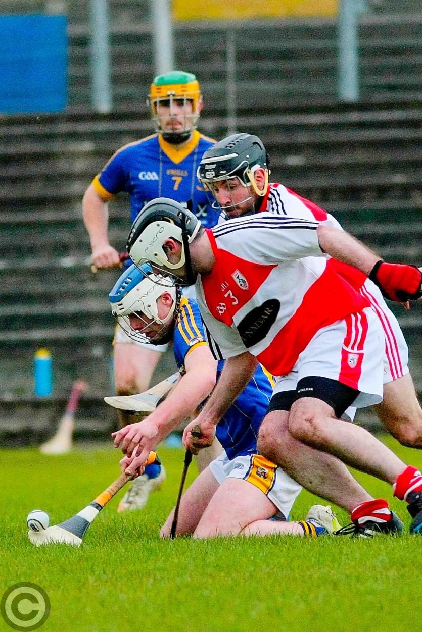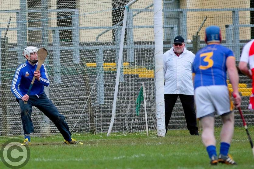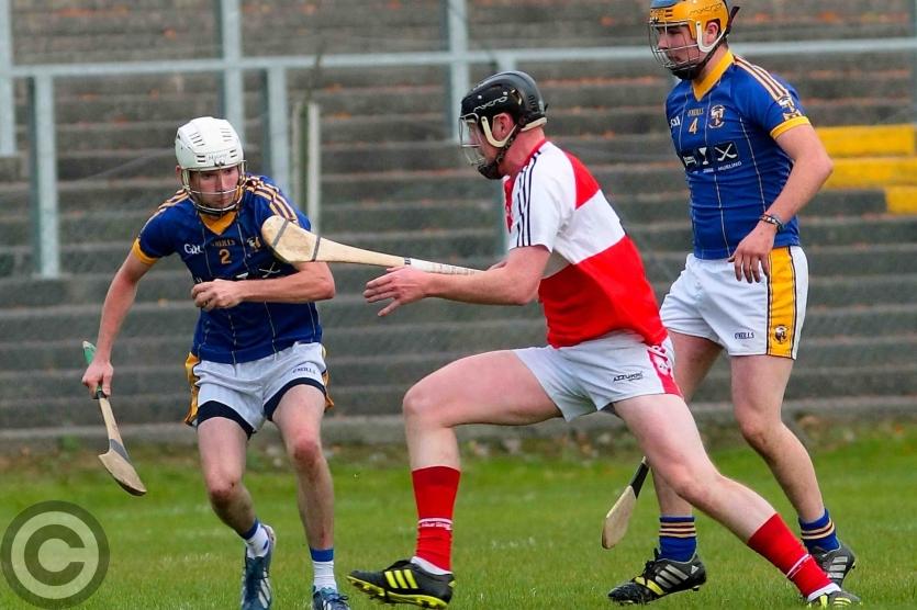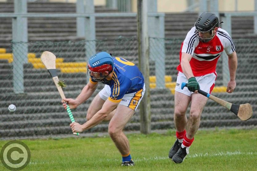 James O'Brien kicks the sliothar away from Liam Moreton with Keeper Karl McDermott in support. Photo by James Molloy