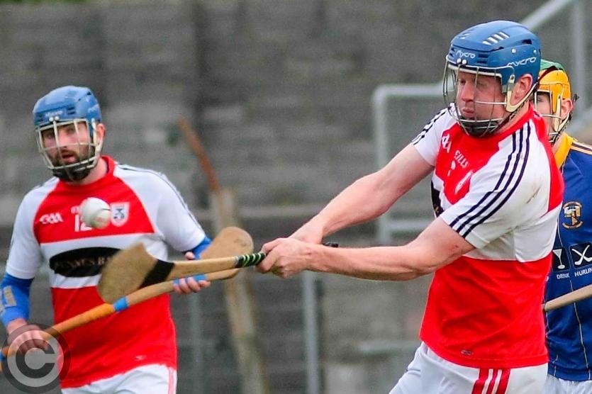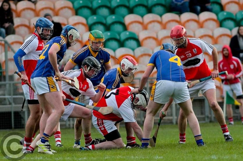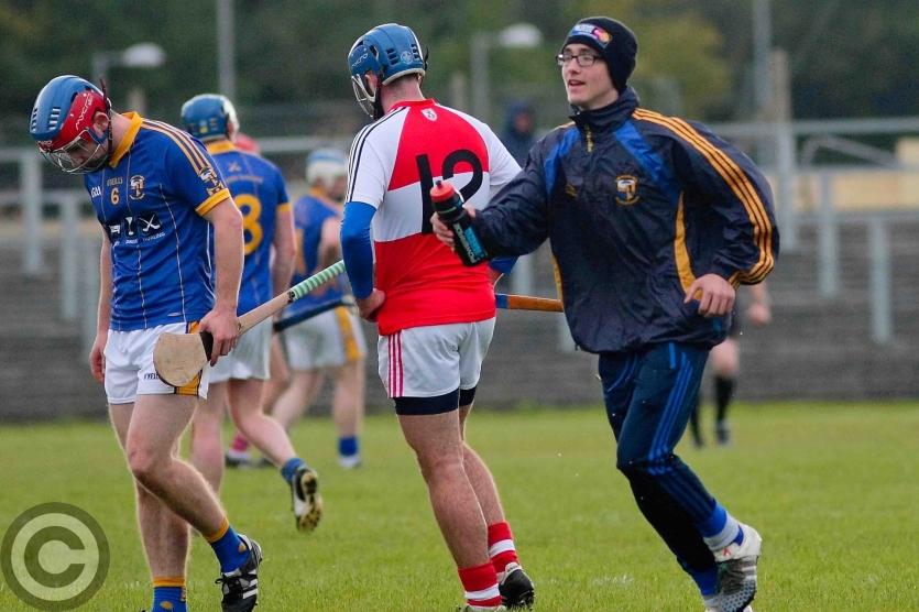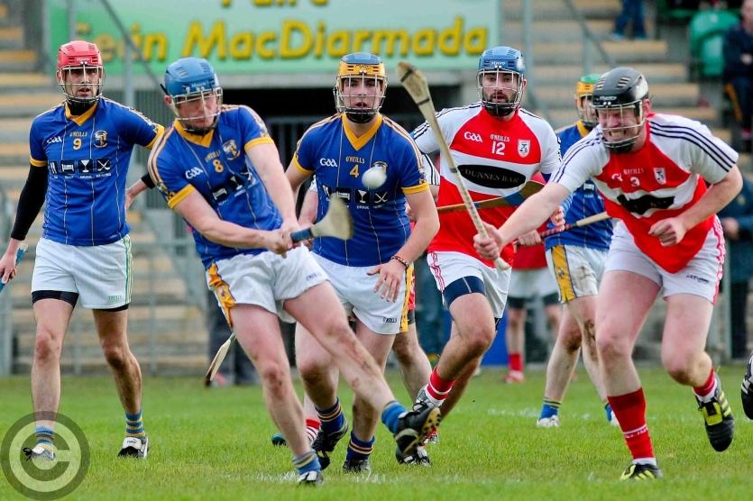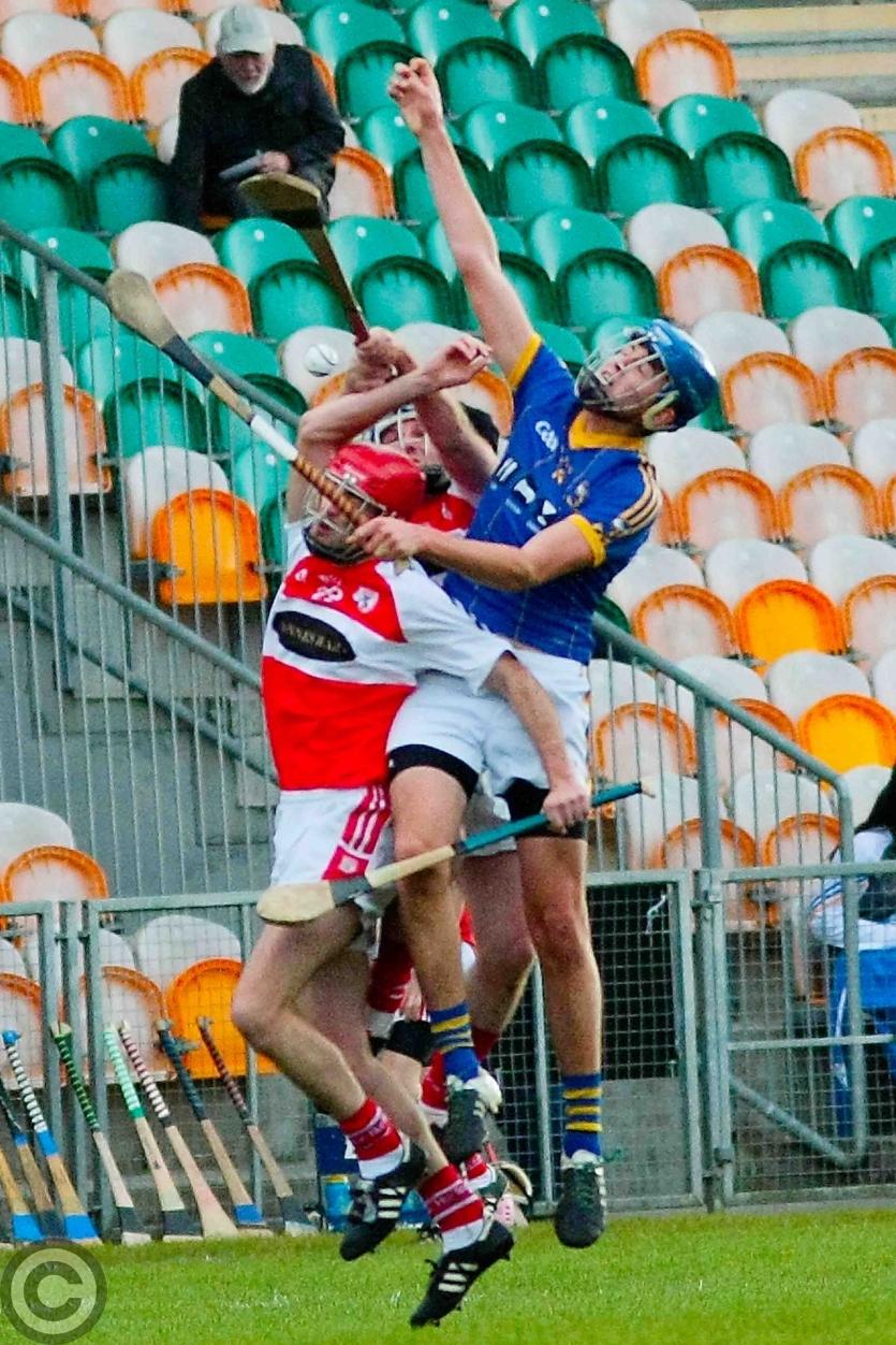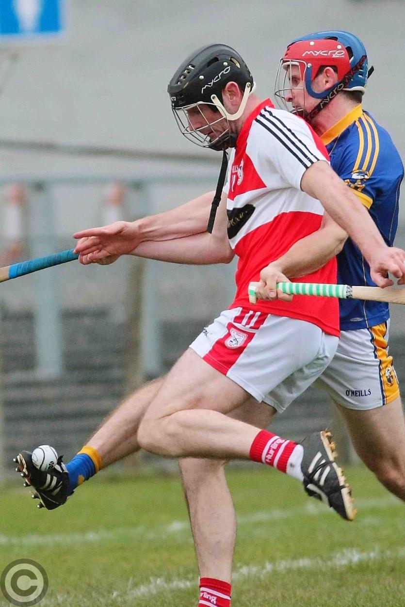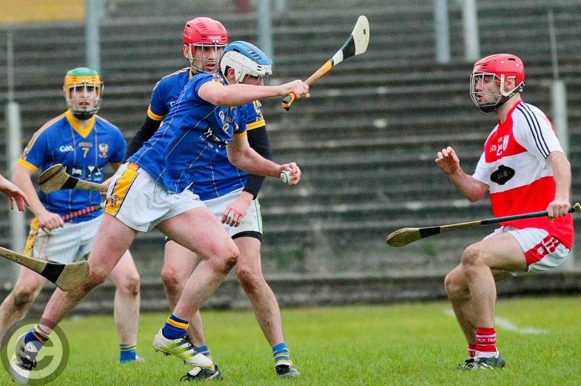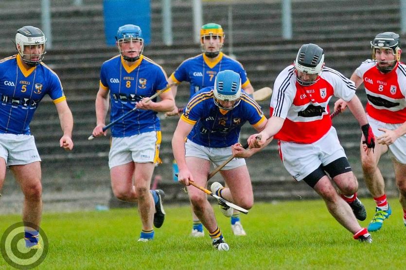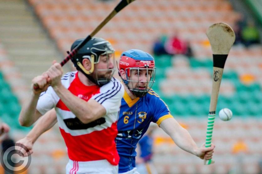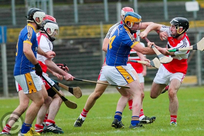James O'Brien kicks the sliothar away from Liam Moreton with Keeper Karl McDermott in support. Photo by James Molloy