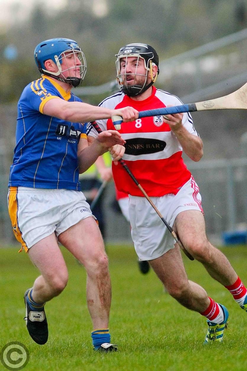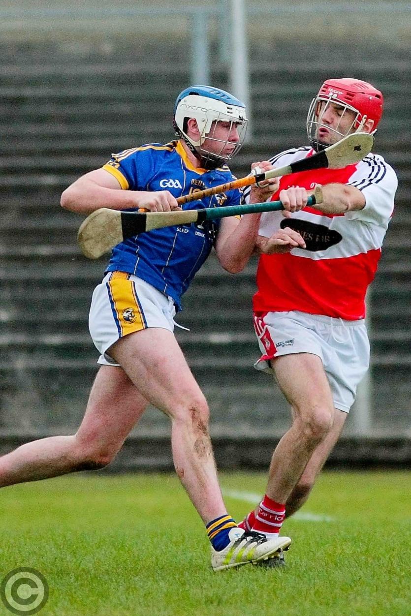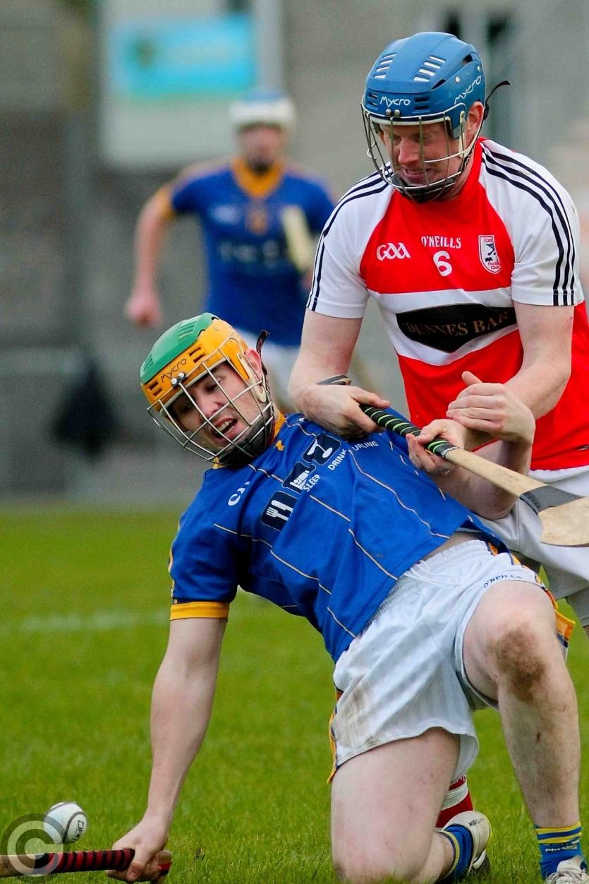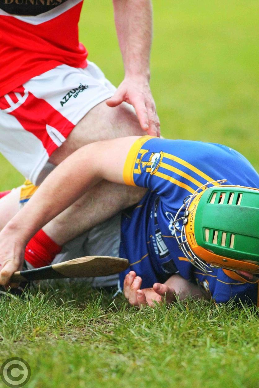 Liam Moreton goes down as Steve Feeney keeps a hold of his hurl. Photo by James Molloy