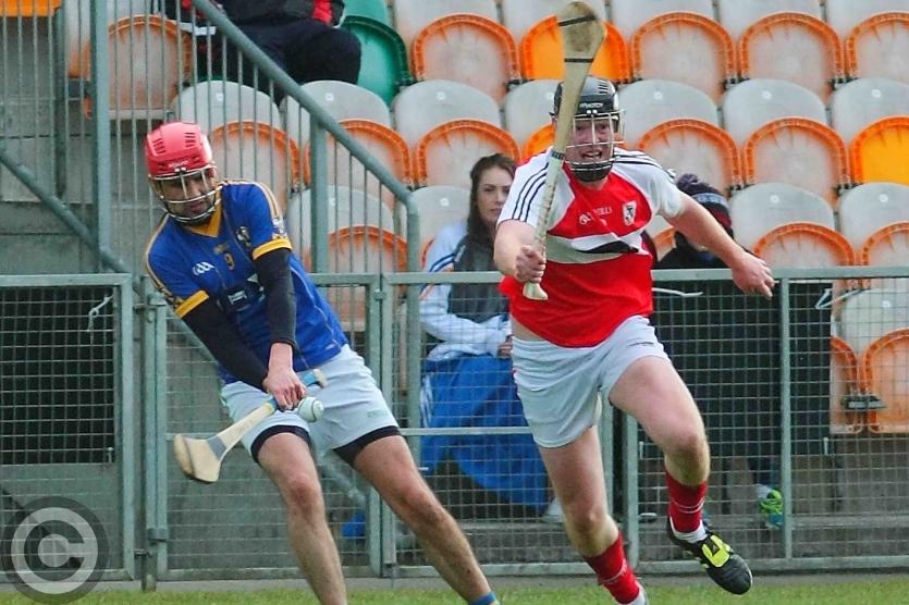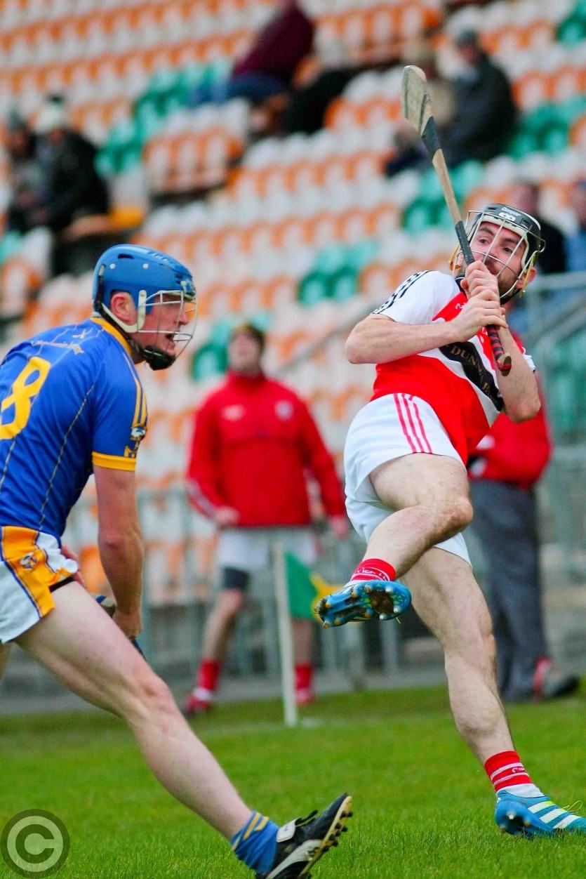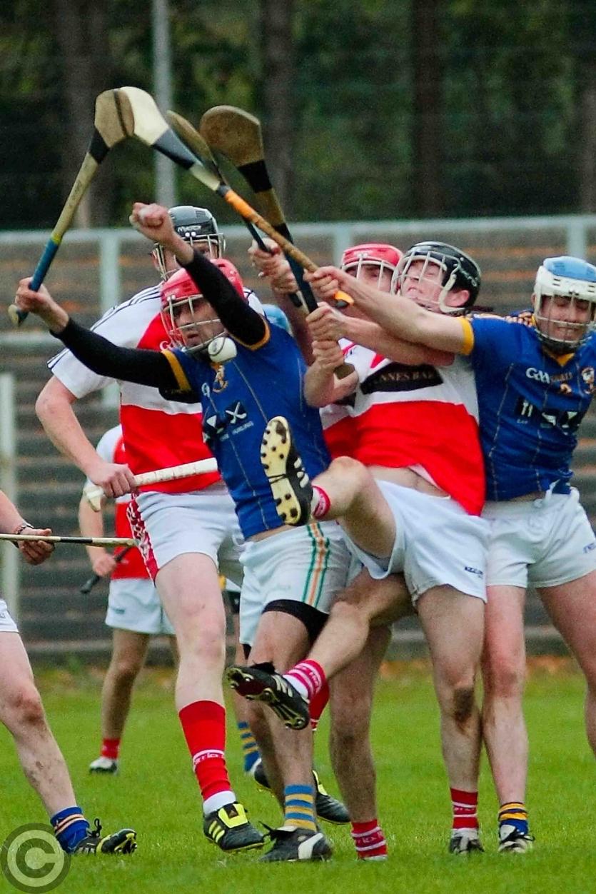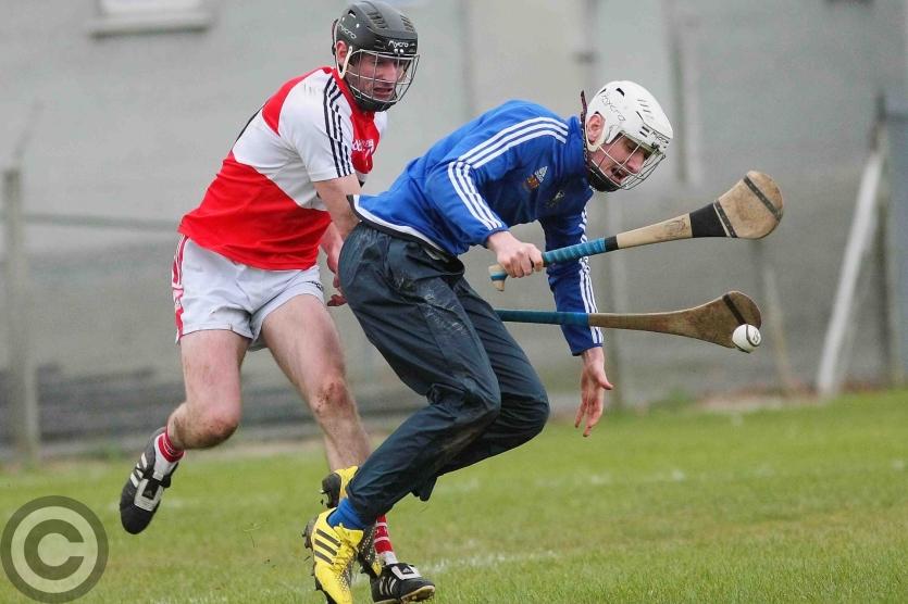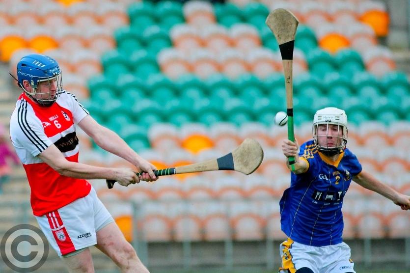 Cathal McCrann gets his shot away despite Patrick Loughlin's attempted block. Photo by James Molloy