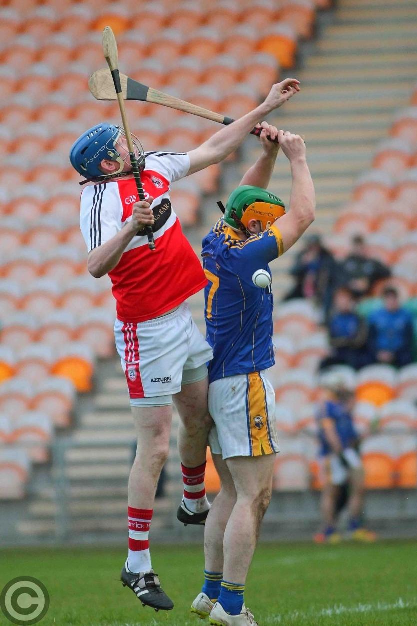 James Glancy clears the sliothar under pressure from Niall McLoughlin. Photo by James Molloy