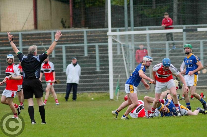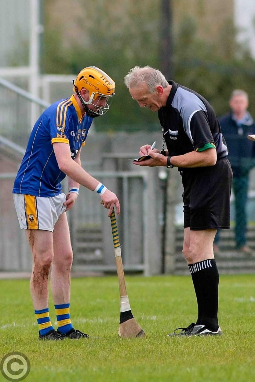 Referee Pat Maguire books Patrick Clancy. Photo by James Molloy