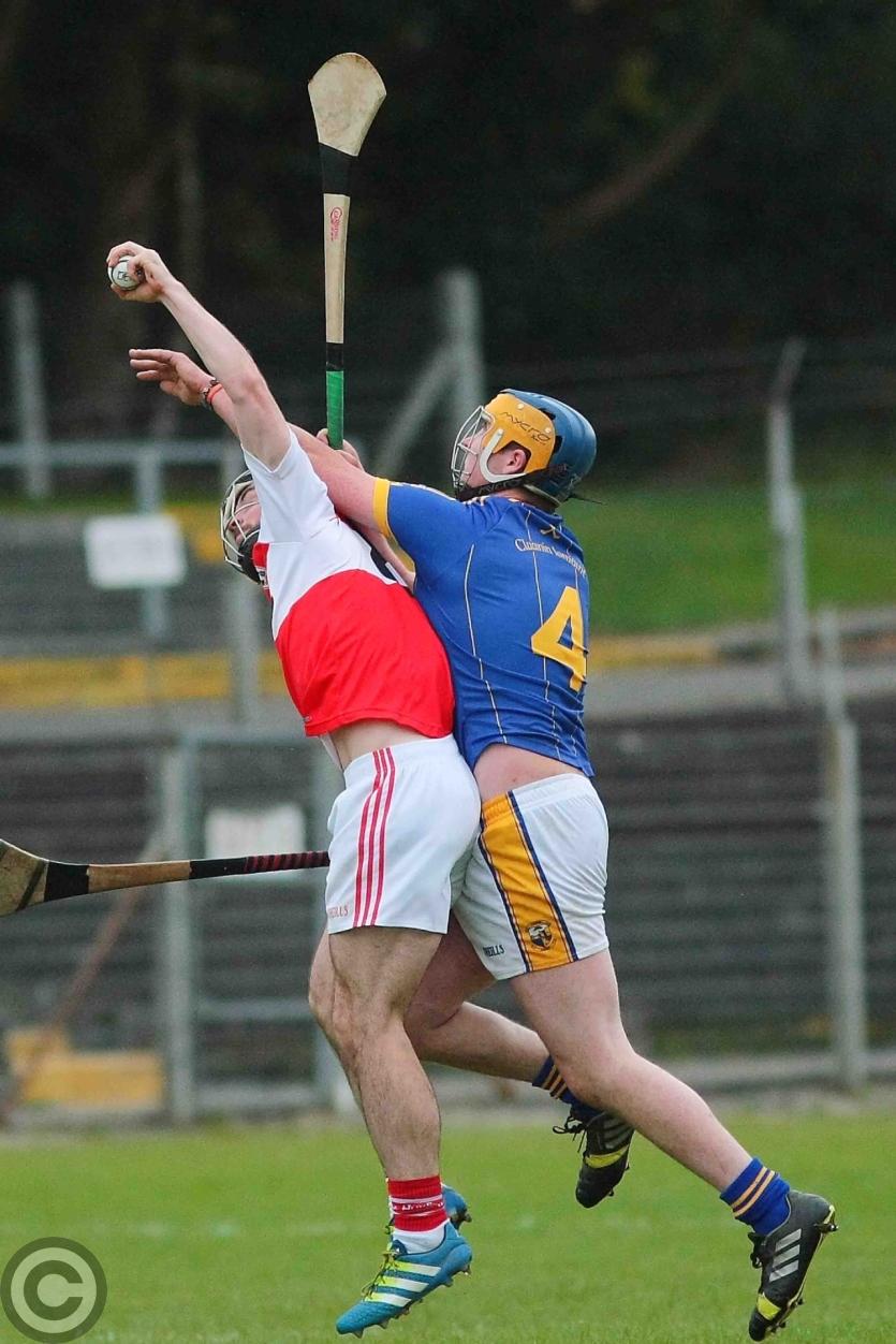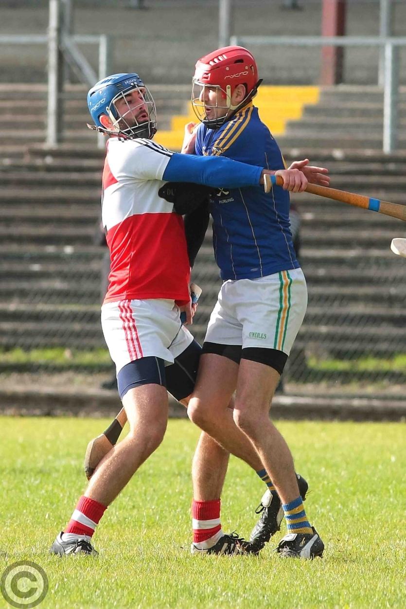 Michael Feely tries to break clear of James Glancy. Photo by James Molloy