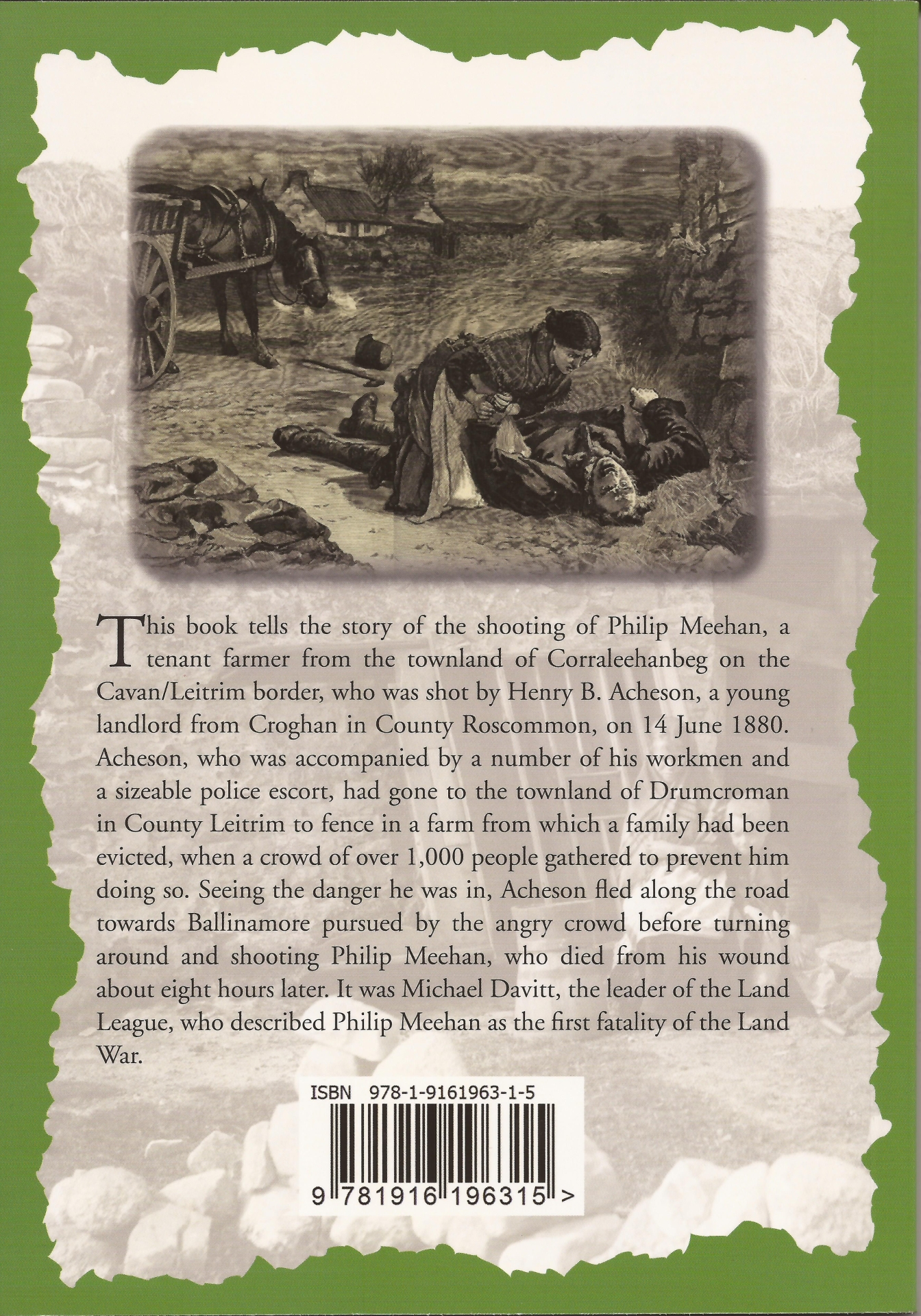 This book tells the story of the shooting of Philip Meehan, a tenant farmer from the townland of Corraleehanbeg on the Cavan/Leitrim border, who was shot by Henry B. Acheson, a young landlord from Croghan in County Roscommon, on 14 June 1880.
