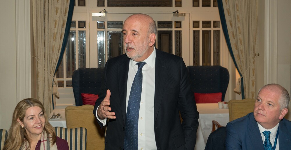 The Governor of the Central Bank Gabriel Makhlouf addressed the lunch event he hosted for a Carrick Chamber delegation. Also pictured is Ballinamore native Anne Marie McKiernan a Director of the Central Bank, and Seamus Newcombe, CEO of Payac Services CLG. Pic – Gerry Faughnan