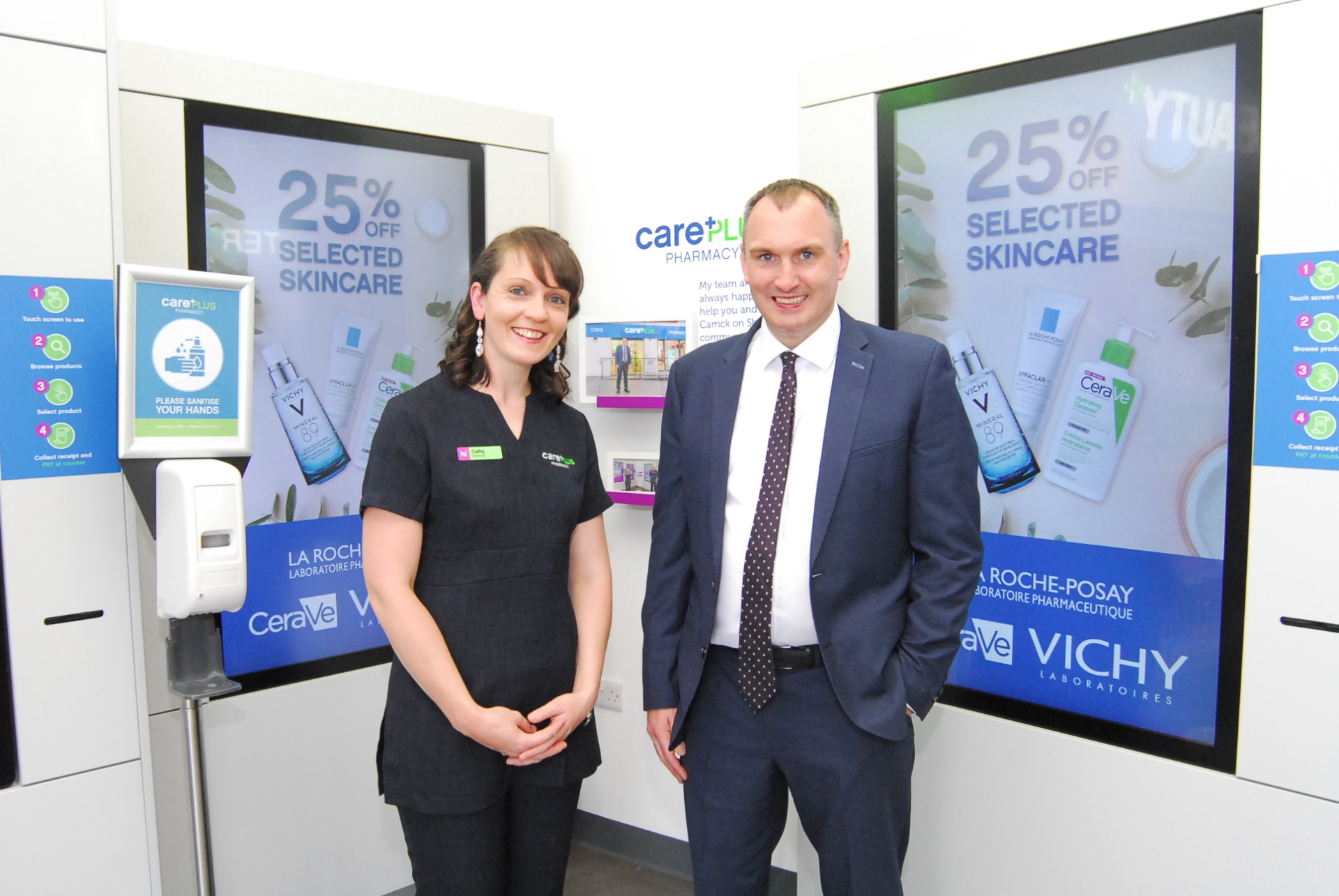 Cathy Hughes, Pharmacy Technician with Cox's CarePlus Pharmacy and proprietor Fintan Cox in front of two of the instore digital screens