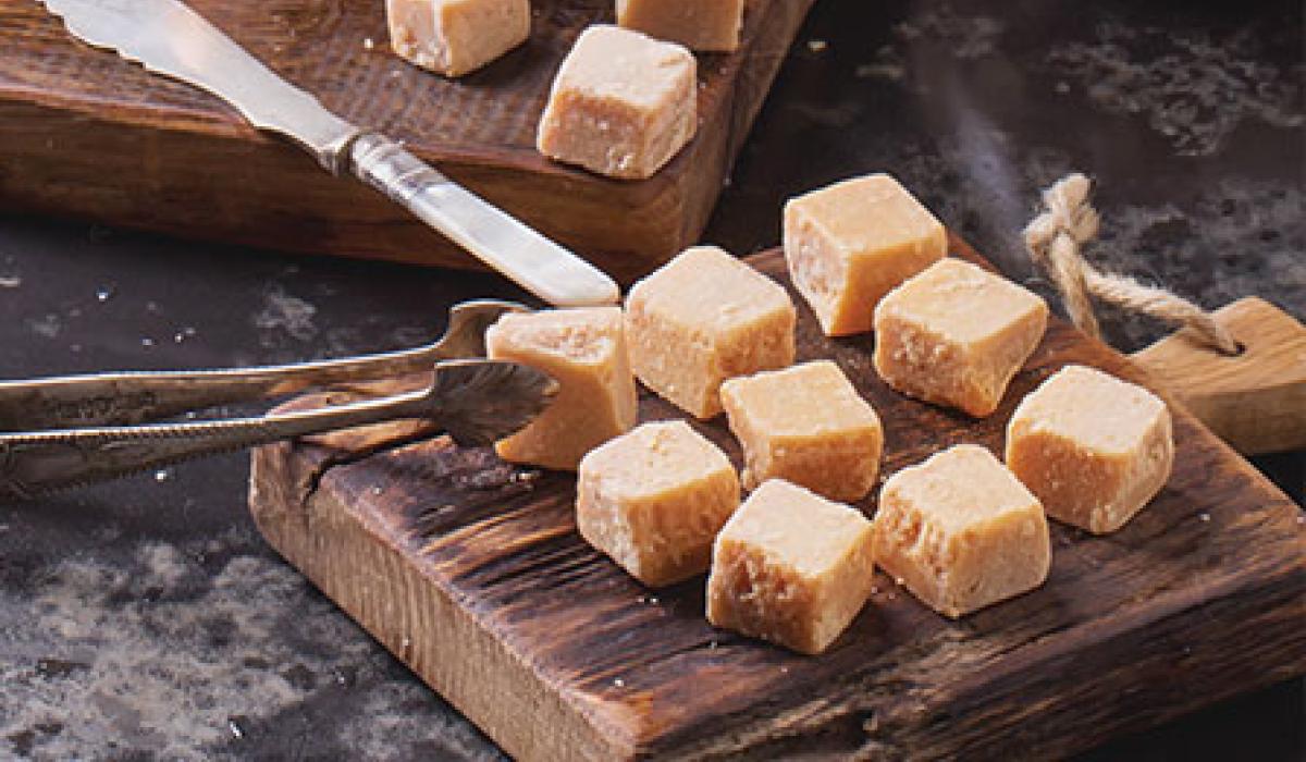 - Before it sets completely, quickly pour the fudge into your prepared tin and smooth over the surface. Leave to cool at room temperature overnight – don’t put the fudge in the fridge as it will become sticky and won’t set properly. Cut into bite-sized pieces and pop in a box or a basket to give as a present. Will keep, in a sealed container, for up to 2 months.