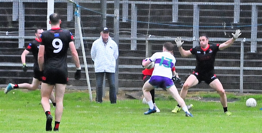 Two more Ryan O’Rourke frees followed, Riordan saw a fisted point attempt hit the woodwork and Wrynn put a free wide but it mattered little, Leitrim Gaels’ one bright spot snuffed out when Aidan Flynn’s goal was ruled out by referee Gareth Foley for a heavy challenge on Ryan Smith after he saved from Regan.