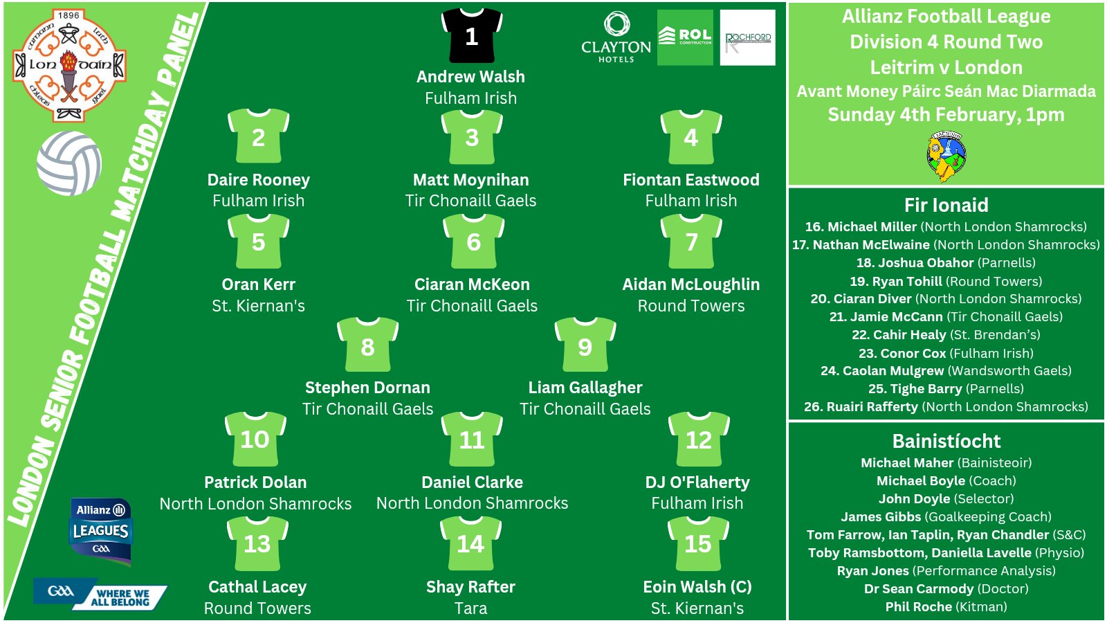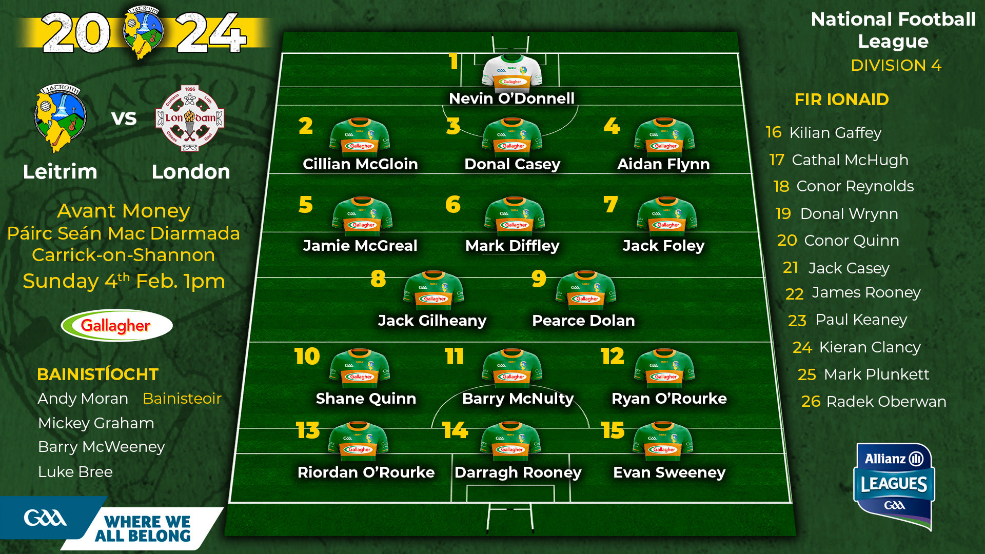 Melvin Gaels Cillian McGloin and Glencar Manorhamilton's Evan Sweeney have both been named to start Sunday's Allianz NFL Division 4 clash against London after manager Andy Moran named his Leitrim team for the game in Avant Money Pairc Sean Mac Diarmada.