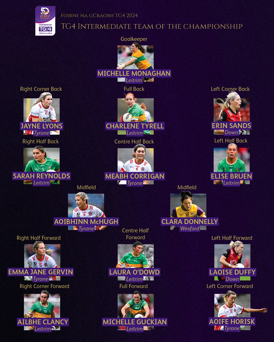 Keeper Michelle Monaghan, defenders Charlene Tyrell, Sarah Reynolds and Elise Bruen and forwards Laura O'Dowd, Ailbhe Clancy and Michelle Guckian have all been honoured on the Team of the Intermediate Championship and will receive their Awards at a special function in Croke Park on Friday October 25.