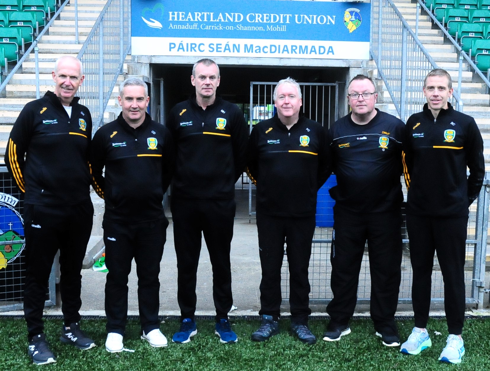 Ballinamore Sean O'Heslins manager Mark Henry (third from left) pictured with his management team of Conor Harte, Conor Doherty, Patsy Connaughton, Daryl McFarland and Brian Cafferty after their semi-final replay win Picture: Willie Donnellan