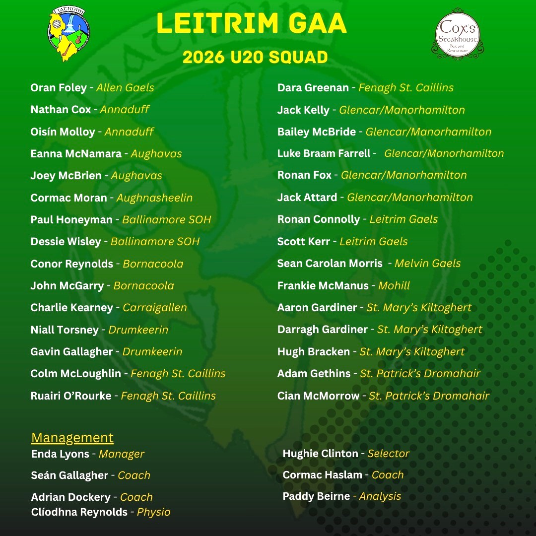 The full Leitrim squad for the Dalata Hotels Connacht U20 Championship is as follows: