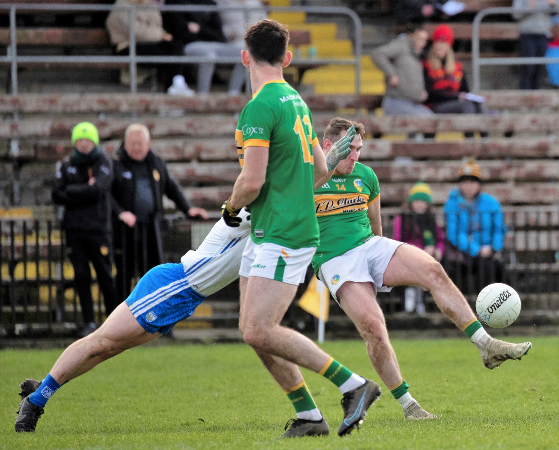 Keith Beirne kicks a point for Leitrim despite an attempted block Picture: Hugh De Paor