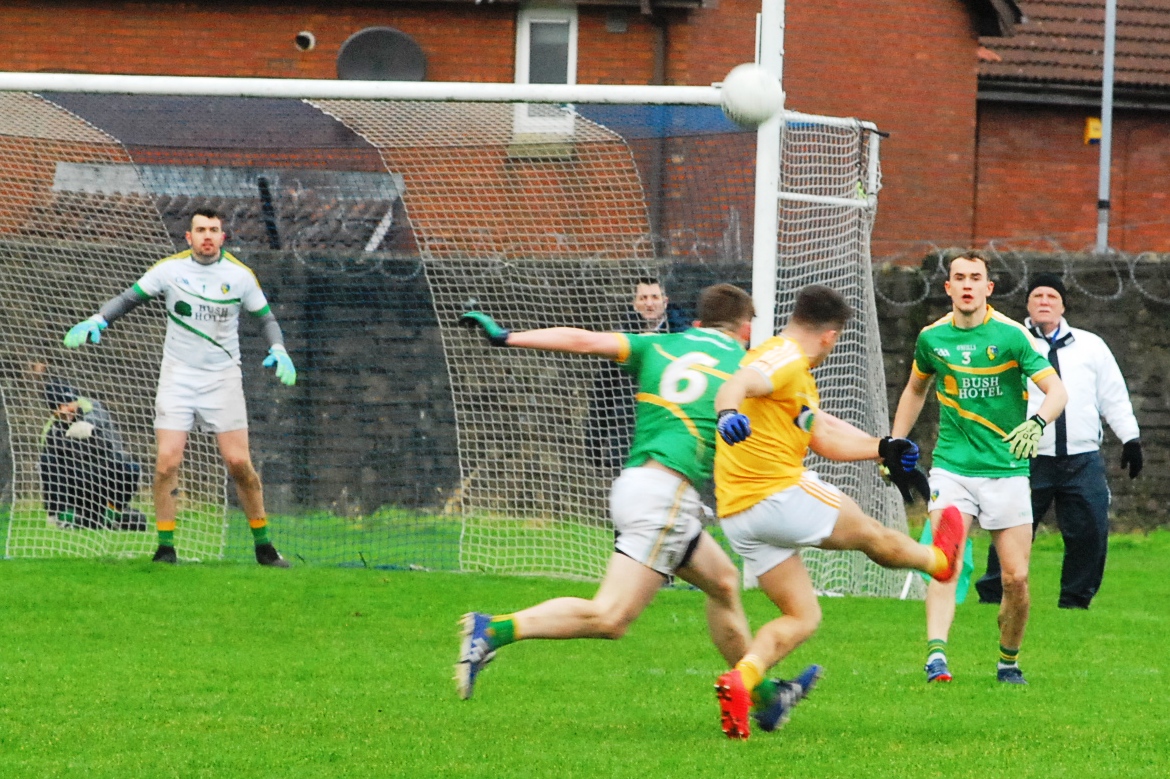 Paddy McBride fires over an Antrim point despite Shane Quinn's attempted block. Photo by Willie Donnellan
