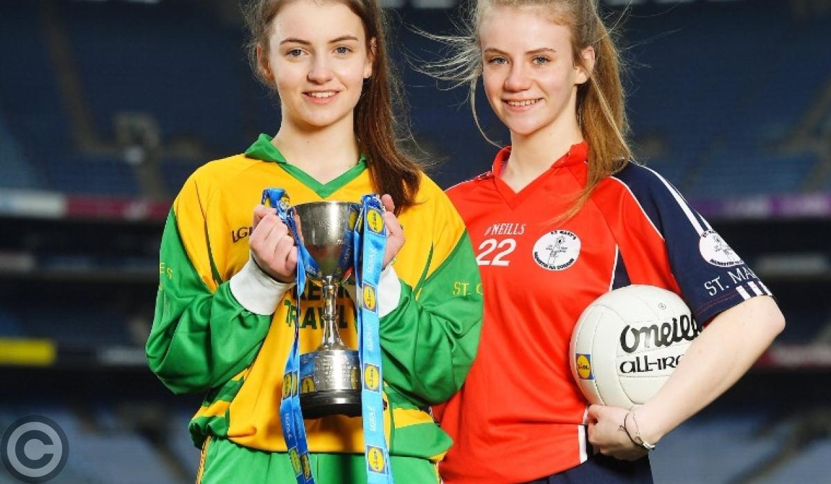 St. Clare’s CS captain Laura Fowley pictured with St. Mary’s Midleton captain Aine O'Driscoll at the Lidl Ladies All-Ireland captains day in Croke Park. Photo by Piaras Ó Mídheach/Sportsfile