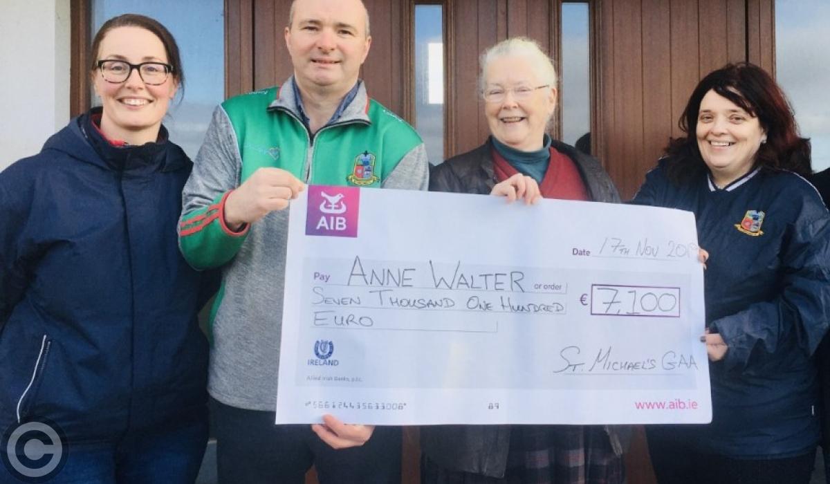 St Michael's GAA Club Roscommon Treasuer Conor McLoughlin presenting lotto winner Anne Walter with her prize of €7,100.