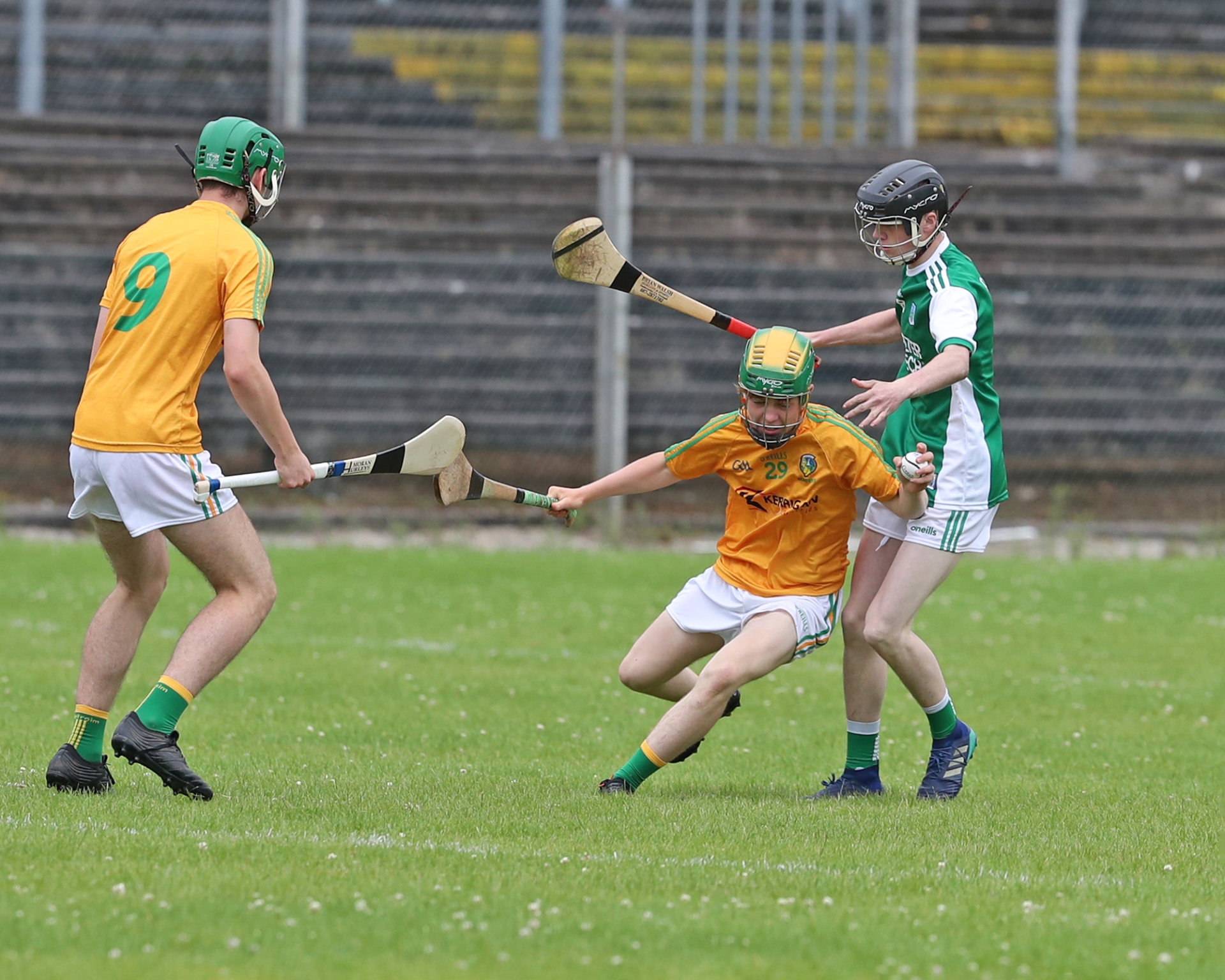 Leitrim's Dean Earley holds off a Fermanagh challenge with teammate Tommy Taylor watching during last Saturday's Celtic Challenge U17 clash in Avant Money Pairc Sean Mac Diarmada