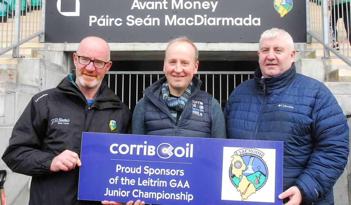 Leitrim County Board Secretary Declan Bohan and Treasurer Martin McCartin pictured with Noel Scally of Corrib Oil Picture: Willie Donnellan