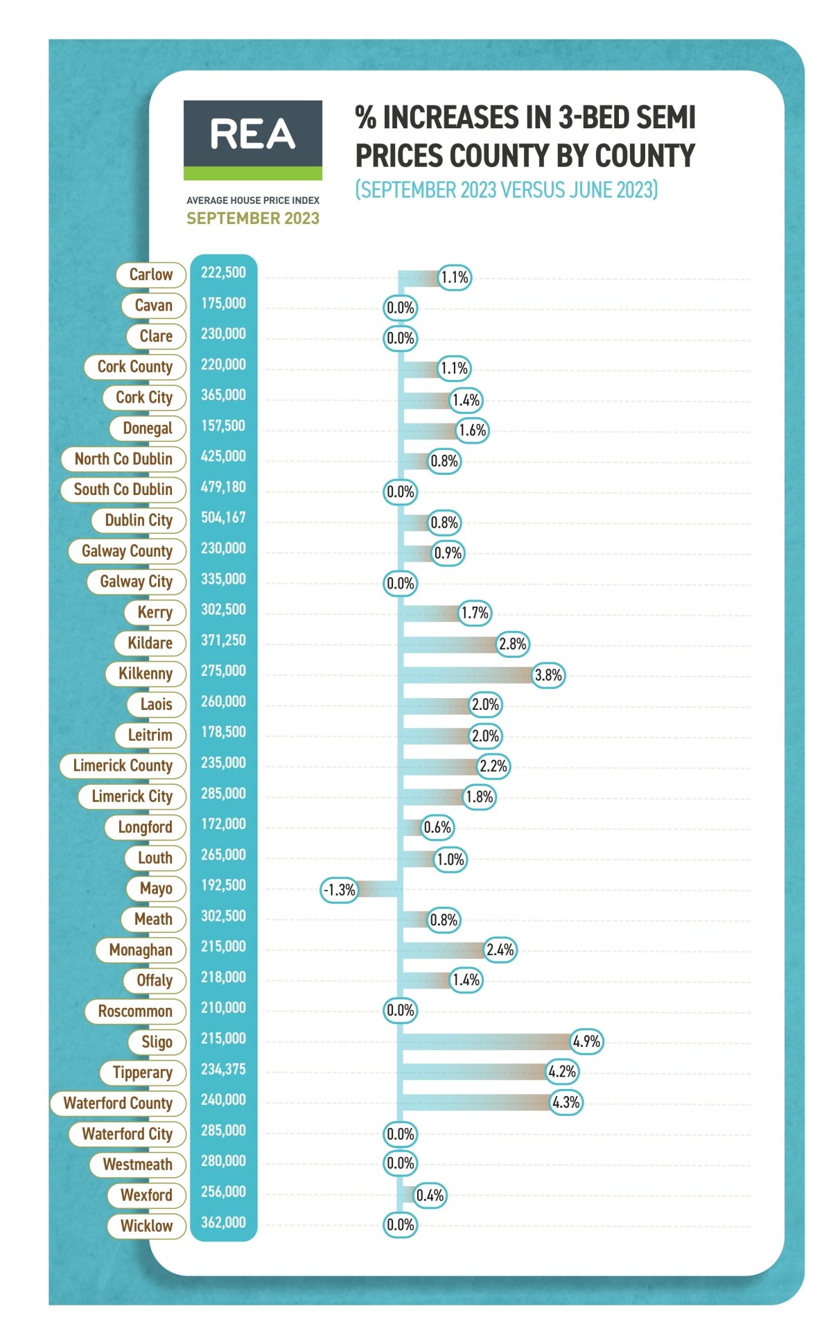 The REA Average House Price Index concentrates on the actual sale price of Ireland's typical stock home, the three-bed semi, giving an accurate picture of the second-hand property market in towns and cities countrywide.