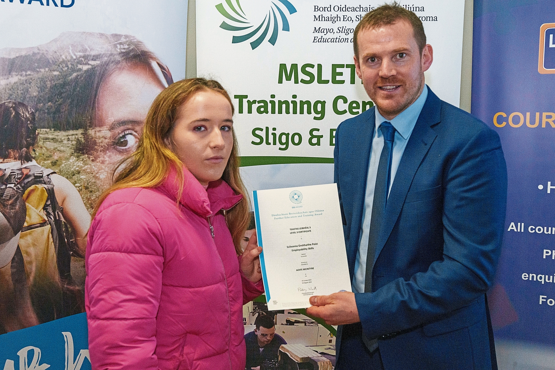Aoife McIntyre receiving her certificate from James McLoughlin, MSLETB
