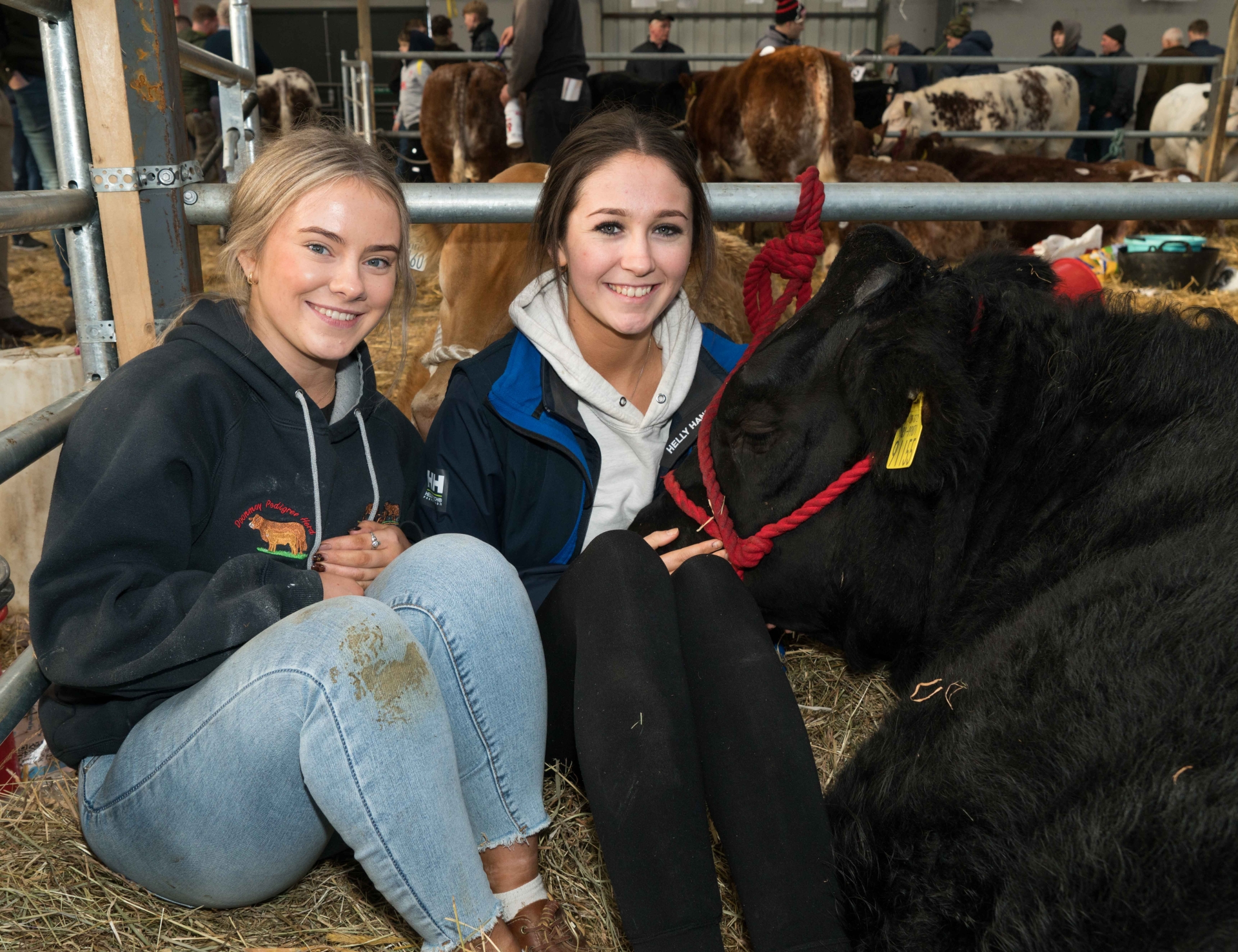 Best friends Ellen Devitt and Noelle O’Sullivan were relaxing with this Belgian Blue cross heifer. Weighing 540kg and owned by Ellen’s father Jack Devitt from Mallow, Co Cork, the heifer went on to sell for €6,200. Pic – Gerry Faughnan