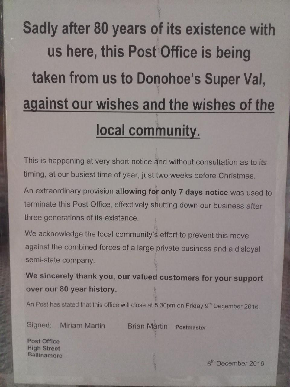 The notice reads, "Sadly after 80 years of its existence with us here, this Post Office is being taken from us to Donohoe's Super Valu, against our wishes and the wishes of the local community."