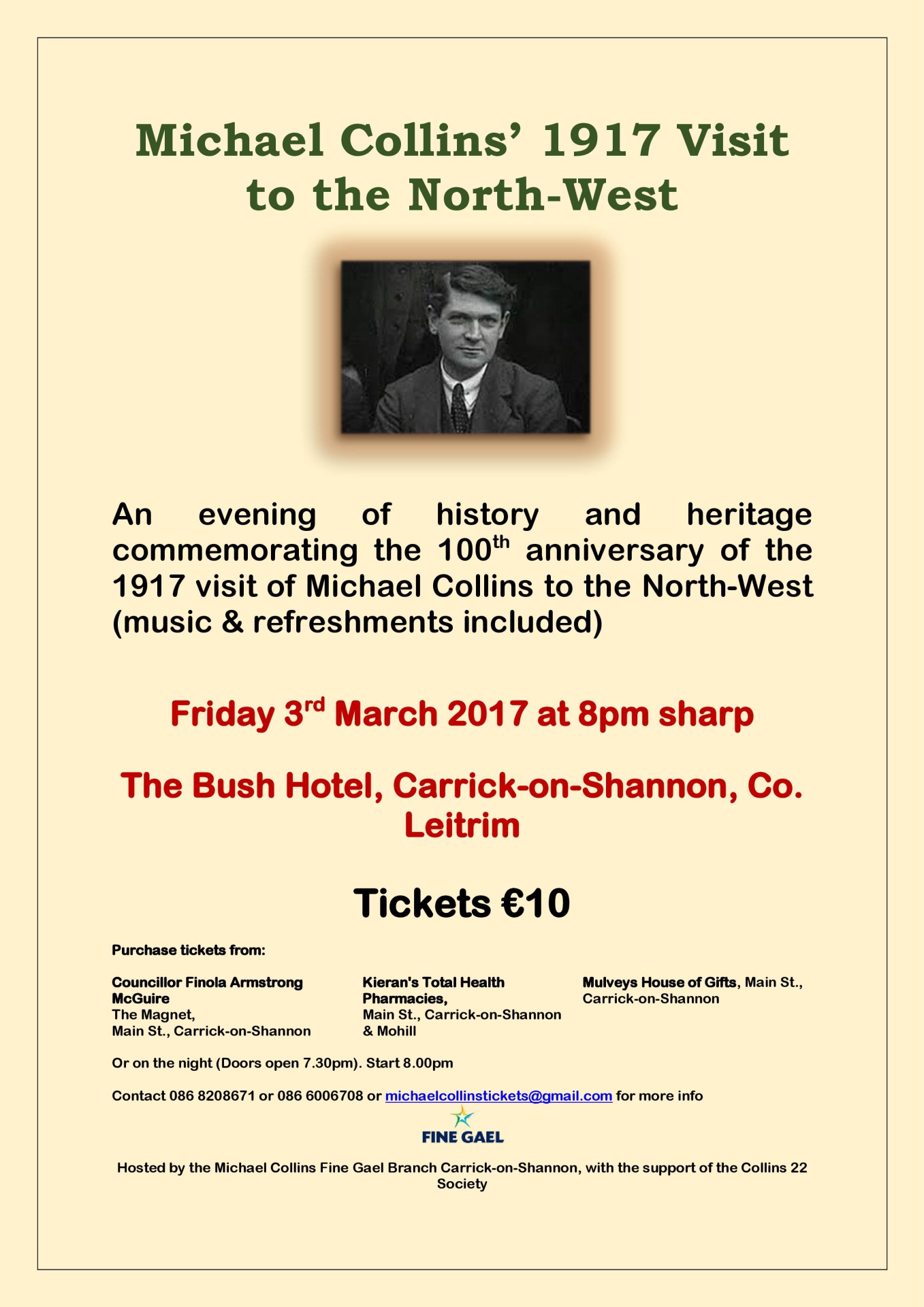This will be a night of history and heritage and is being organised by the Michael Collins Fine Gael Branch Carrick-on-Shannon with the support of the Collins 22 Society.