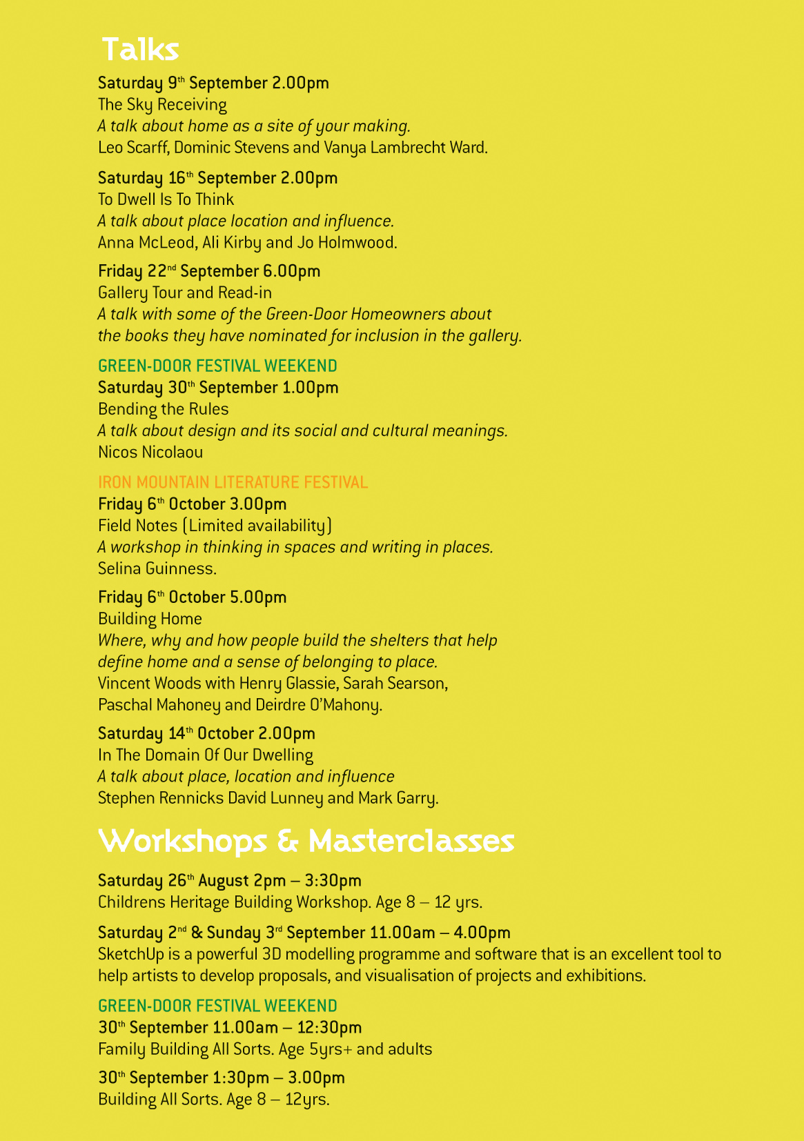 The 'Thinking Living Dwelling' exhibition, which will be held in The Dock, Carrick-on-Shannon is designed to underpin and celebrate the extraordinary achievements of Leitrim's Green Door Festival which runs this year from Friday, September 29 - Sunday, October 1 all over Leitrim.