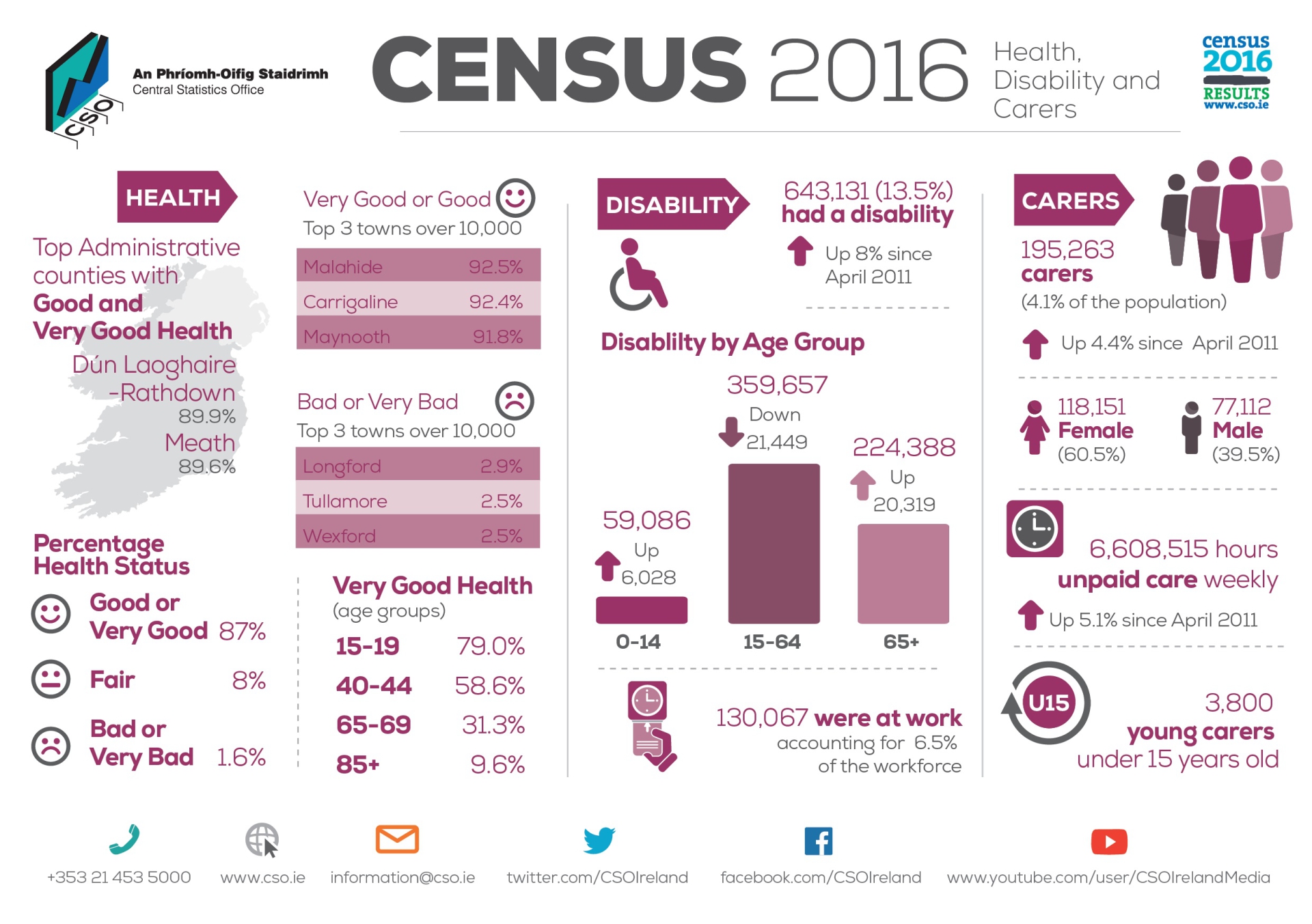 Deirdre Cullen, Senior Statistician, commented: “Census 2016 was the second census in which the Irish public were asked to rate their own health so we can now make comparisons over time. The report also provides detailed data and analysis on those with a disability while also examining changes in relation to carers, looking at issues such as the age and gender profile of carers, the number of carers in each county, and the hours of care provided.”