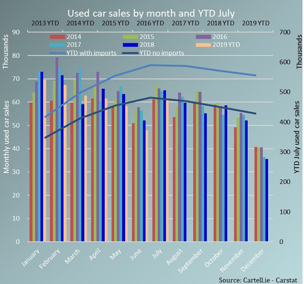 Vehicle history and data expert Cartell.ie announce today the findings from the latest state of the market report in conjunction with BAC Auto Consulting, reporting used car sales for the first seven months of 2019 are down 4.2% including imports and down 4.4% excluding imports.