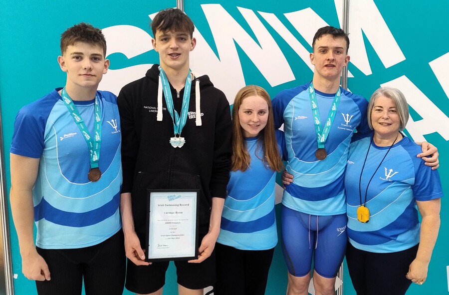 Cormac Rynn (second from left) pictured with his Trident SC clubmates Conor Lanigan, Clara Doherty, Eoghan Rynn and coach Helen Kennedy after Cormac set an Irish record