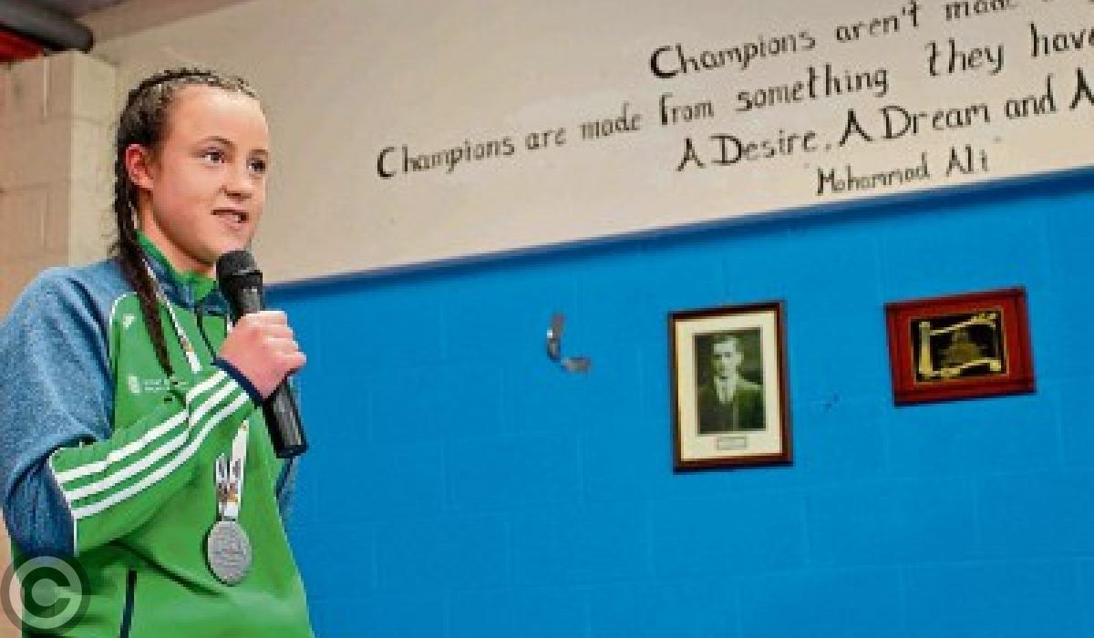 European Youth Boxing Championship silver medalist Déarbhla Rooney addresses the audience at the homecoming. Photo by James Molloy