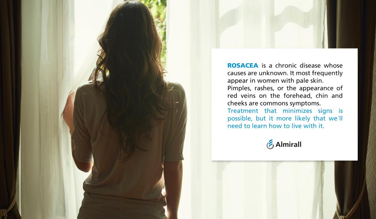 Rosacea is a chronic skin disease that can cause flushing and redness, typically of the face, bumps, and spider-like veins. Over time, flare ups can progress and the skin may take on a roughened, orange peel texture. Due to its highly visible nature, rosacea takes a particularly heavy toll on patients. As of yet, there is no cure. Pimples, rashes, or the appearances of redness on the chin, forehead and cheeks are common symptoms that may come and go.