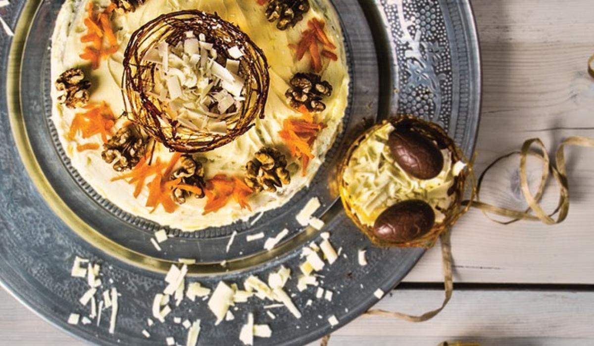 Using a spatula, roughly cover the top and sides with half of the remaining icing - this 'crumb layer' will make for a smoother finish all over. Set in the fridge for 10 minutes, then cover with the remaining icing. Decorate the cake with walnut halves, grated carrot, white chocolate shards or little nests with chocolate eggs - in honour of Easter!