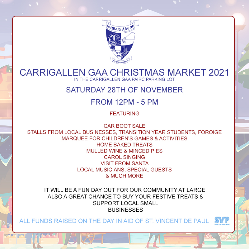 Carrigallen GAA are hosting a Christmas Market in the GAA car park this Sunday, November 28, from 12pm to 5pm.
