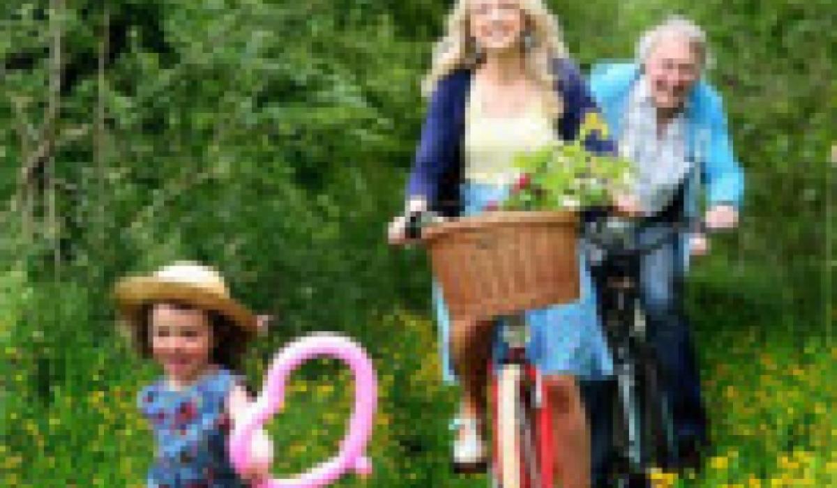 Three-year-old Súin Murphy Keegan stays ahead of Sean Nós dancer Edwina Guckian and playright/actor Donal O’Kelly as they cycle the lanes of Leitrim around Dromahair last Sunday when details were announced of next Saturday’s (14th June ) cycling event, Tour of The Fracking Country.
