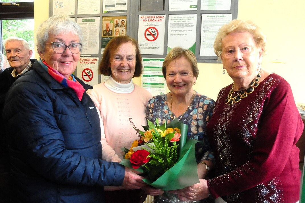 Retiring Drumkeerin Postmistress Mary Bohan is presented with flowers by, from left, Rosealeen Harkin, Mary Harrison and Josephine White on behalf of the local community last Friday October 31 Picture: Willie Donnellan