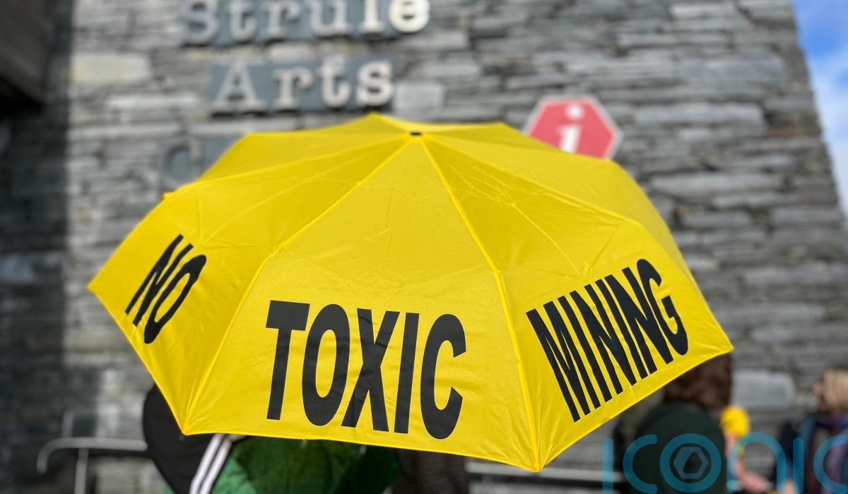 Those opposing the mine gathered outside the venue in Omagh, with yellow umbrellas saying “no toxic mining”, and chanted “Dalradian out”.