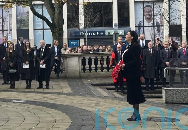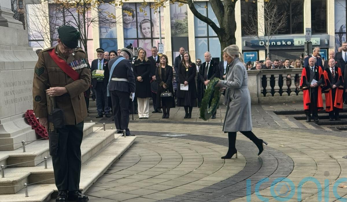 Northern Ireland’s First Minister Michelle O’Neill and deputy First Minister Emma Little-Pengelly laid wreaths at the cenotaph at Belfast City Hall as part of a Remembrance Sunday ceremony.